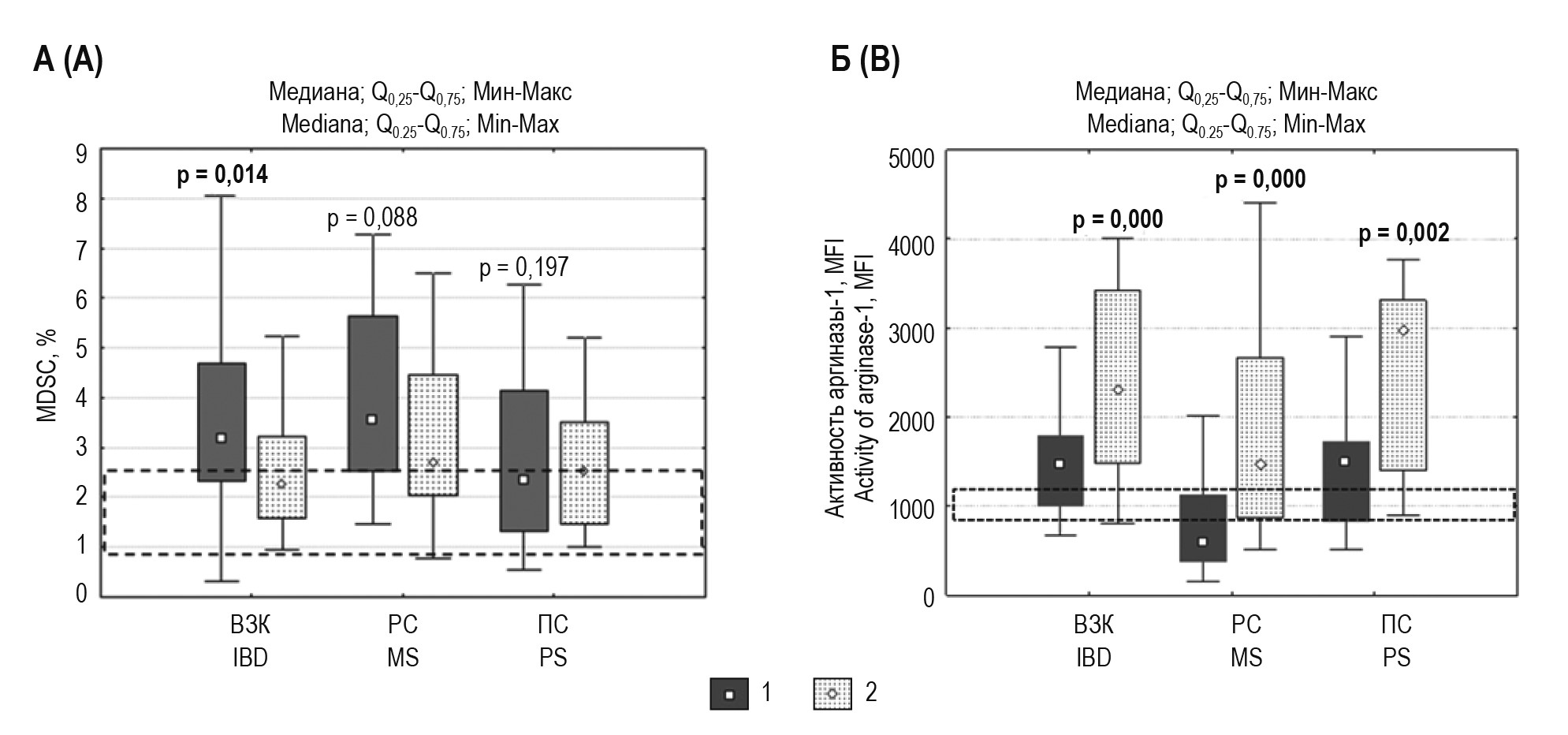 Рисунок 1. Относительное содержание MDSCs (A) и активность Arg-1 (Б) у пациентов с ВЗК, РС, ПС при обострении (1) и ремиссии (2)