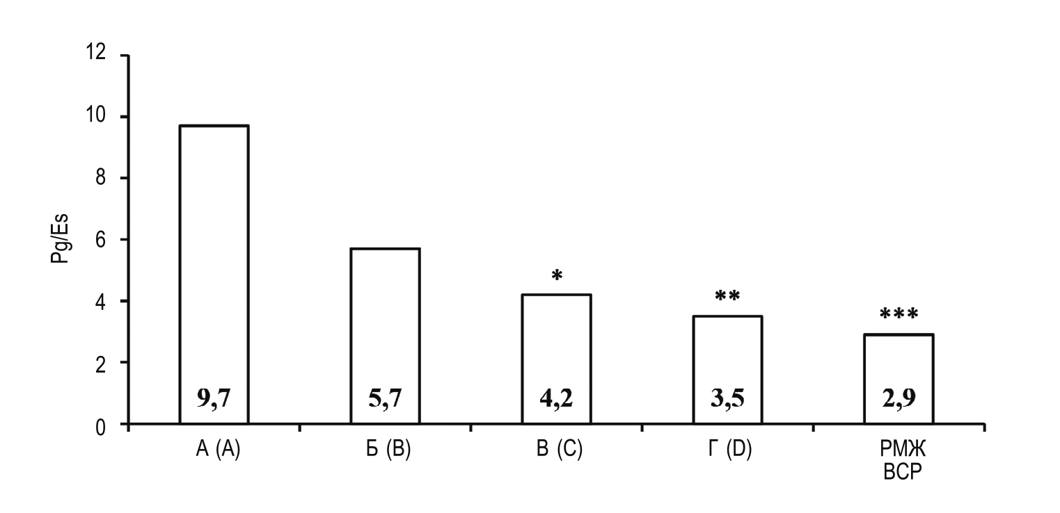 Максимальное значение Pg/Es (9,7) выявлено у здоровых женщин с протективным иммунологическим фенотипом, минимальное (3,5) – с проканцерогенным, которое незначительно отличалось от такового у больных РМЖ. Низкие значения Pg/Es у женщин с проканцерогенным фенотипом обусловлены повышением содержания в сыворотке Es и снижением Pg, у женщин с компенсаторными фенотипами – только снижением концентрации Pg.