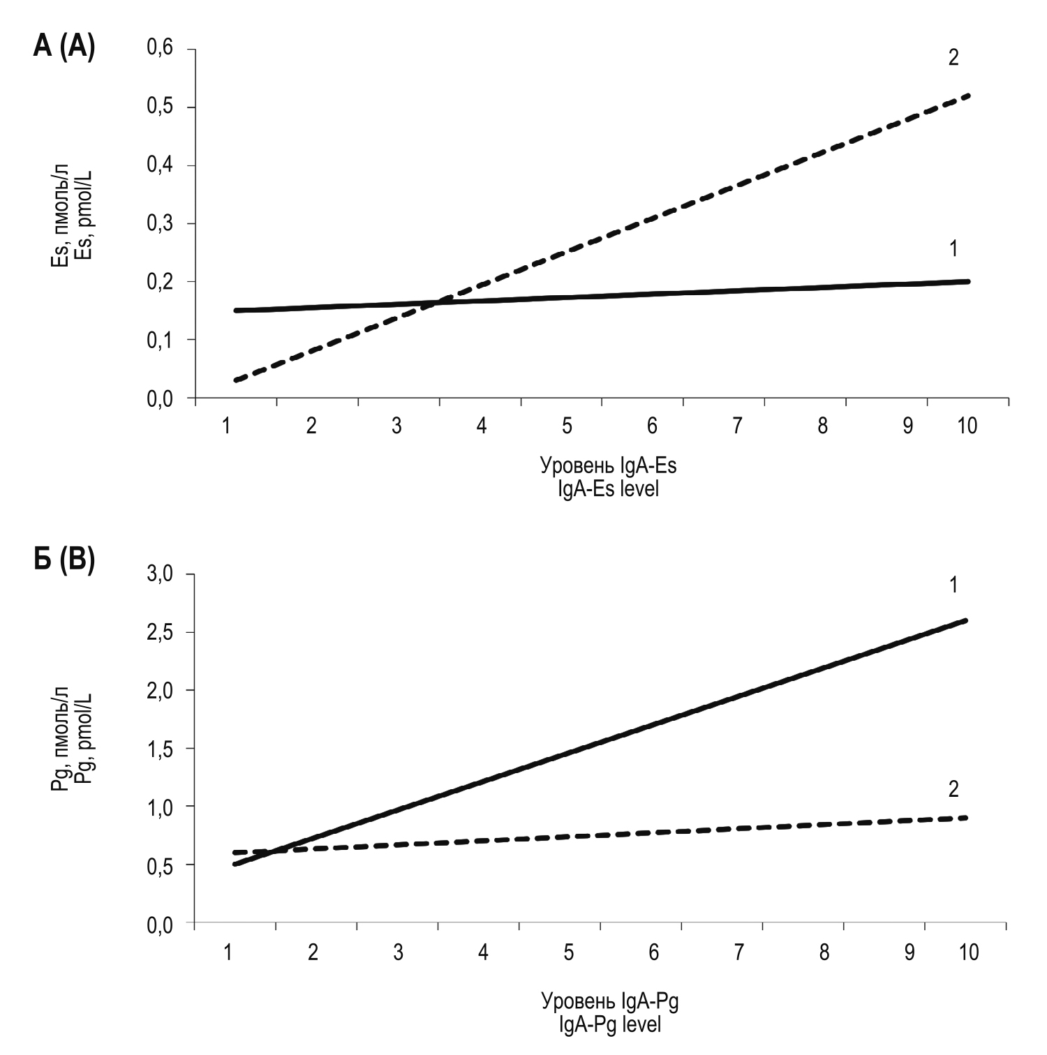 Концентрация Es не зависела от уровня IgA-Es при низких уровнях IgA-Bp, но повышалась с ростом IgA-Es при высоких уровнях IgA-Bp (r = 0,38, p < 0,001; рис. 3А). Напротив, концентрация Pg повышалась с ростом IgA-Pg при низких уровнях IgA-Bp (r = 0,49, p < 0,001), но не зависела от IgA-Pg при высоких уровнях IgA-Bp (рис. 3Б).