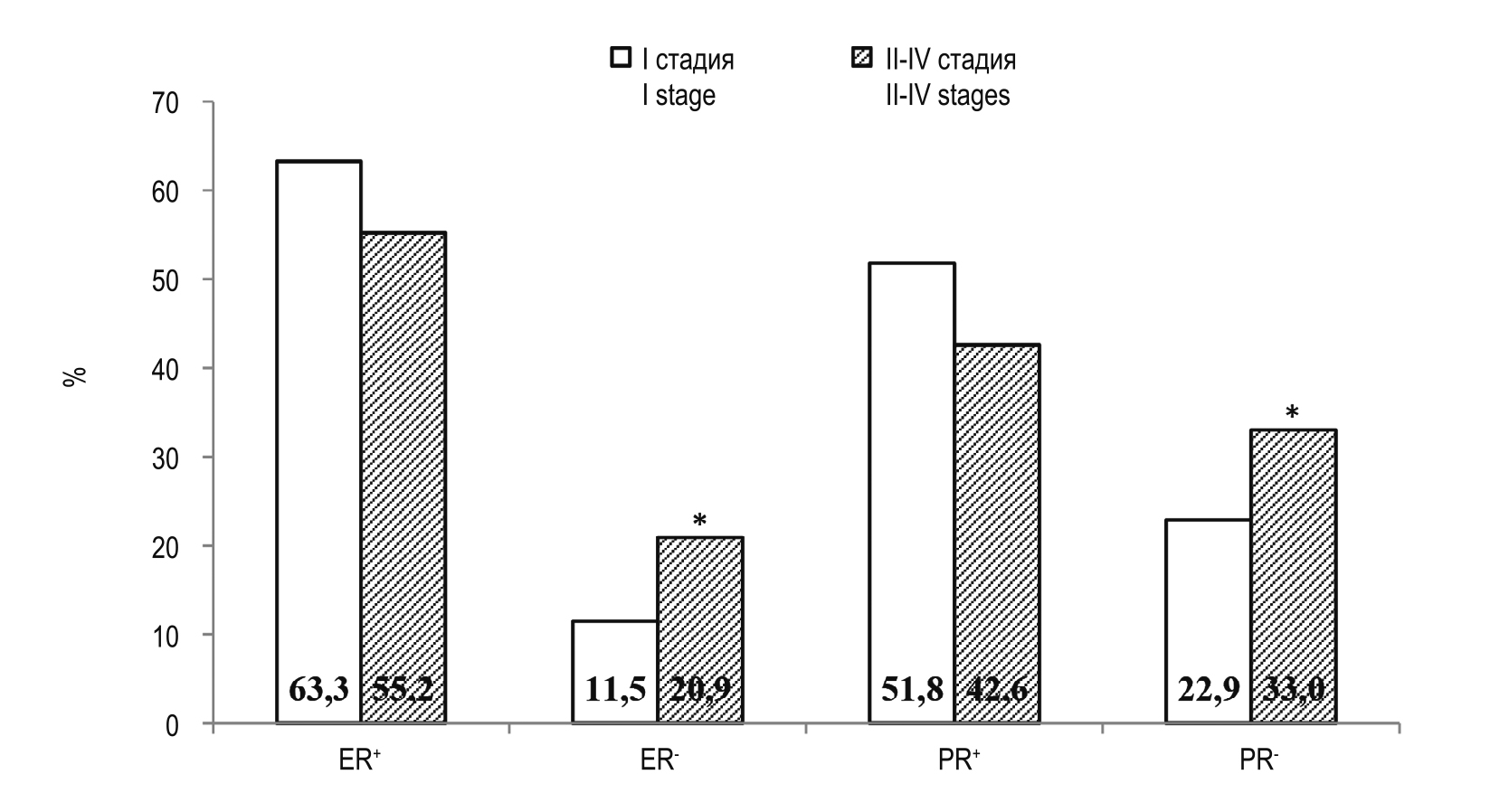 Сравнение больных РМЖ в начале опухолевого роста (I стадия) и его прогрессии, инвазии и метастазирования (II-IV стадии) показало следующее. При высоких значениях IgA-Es/IgA-Pg > 1,0 удельный вес ER+ опухолей у больных РМЖ II-IV стадии был меньше (55,2%), а ER- больше (20,9%), чем у больных с I стадией РМЖ (63,3% и 11,5% соответственно, р < 0,0001). Аналогичные различия обнаружены и при анализе прогестероновых рецепторов (рис. 4). При низких значениях IgA-Es/IgA-Pg ≤ 1,0 подобной разницы не обнаружили.