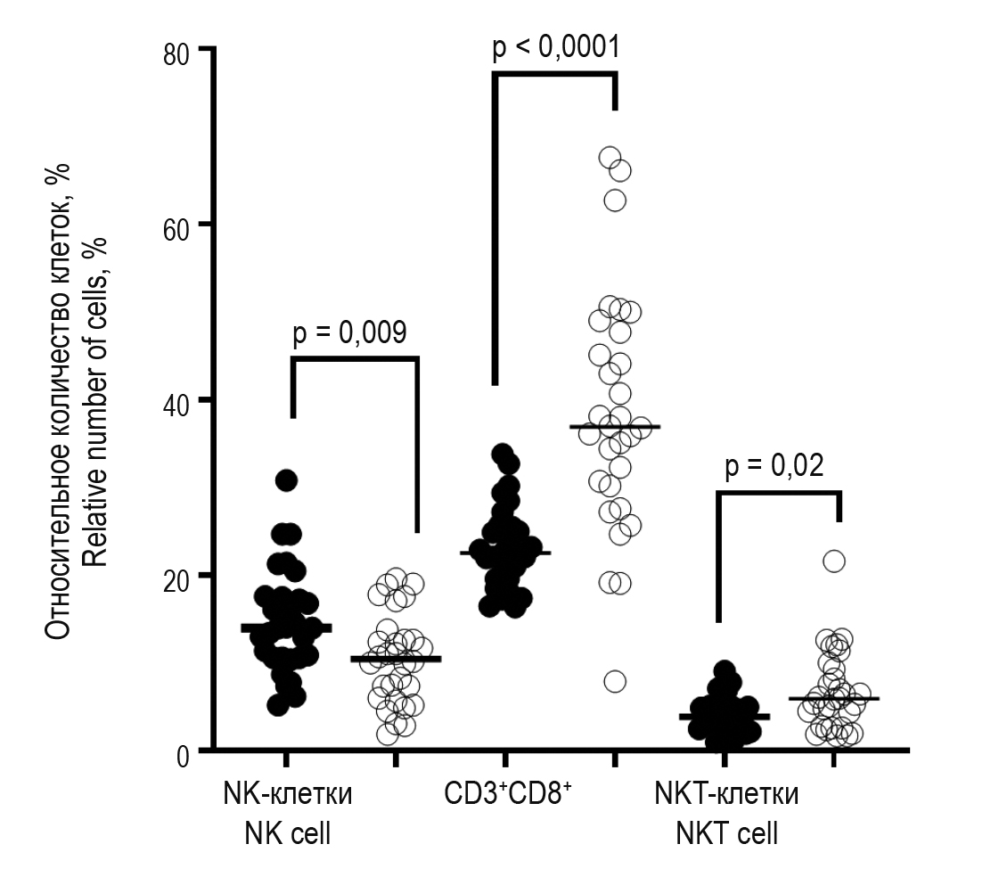 Относительное количество циркулирующих NK-клеток было сопряжено с содержанием Т-цитотоксических лимфоцитов (rs% = -0,545, p = 0,03), но не NKT-лимфоцитов. В то же время у здоровых лиц с содержанием Т-киллеров достоверно коррелировали именно NKT (rs% = 0,517, p = 0,003), а не NK-лимфоциты.