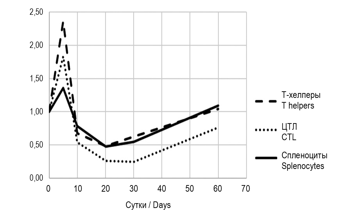 Начиная с 30-х суток (табл. 1, рис. 1) численность Т-хелперов и ЦТЛ начала увеличиваться. Для Т-хелперов процесс восстановления занял 2 месяца: к 60-м суткам число Т-хелперов мышей опытной группы достигло уровня Т-хелперов мышей в контроле.