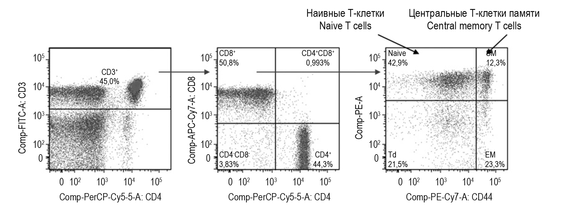 Рисунок 2. Алгоритм цитометрического определения субпопуляций наивных и центральных Т-клеток памяти на примере ЦТЛ селезенки интактной мыши линии C57BL/6