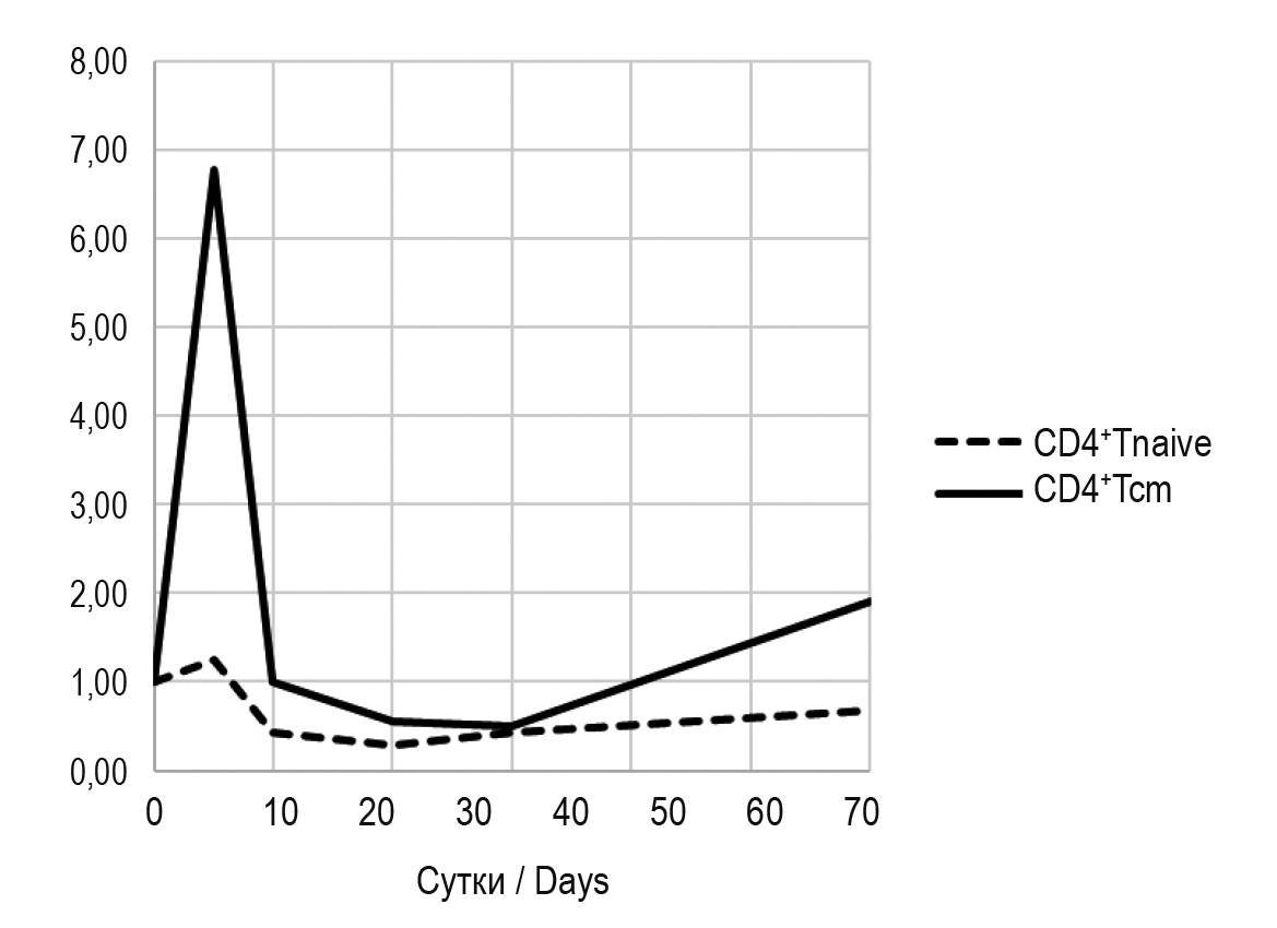 Примечание. По оси абсцисс отмечены сутки после введения ЦФ, по оси ординат – соотношение Tnaive/Tcm. К 60-м суткам наблюдается снижение соотношения Tnaive/Tcm для обеих субпопуляций Т-клеток: в 2 раза для Т-хелперов и в 1,6 раза для ЦТЛ.