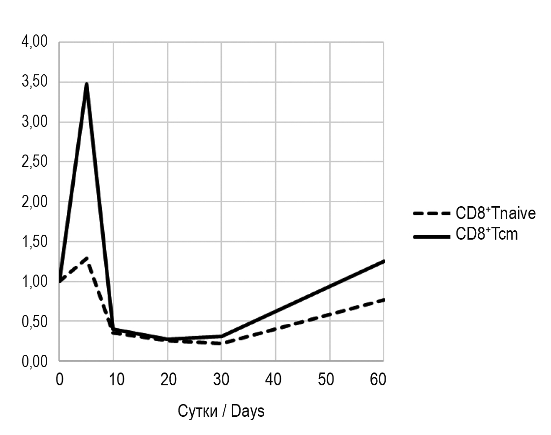Примечание. По оси абсцисс отмечены сутки после введения ЦФ, по оси ординат – нормализованные данные по количеству клеток, где за 1 принято значение контроля. На 5-е сутки количество Tnaive и Tcm значительно увеличивается, к 30-м суткам – уменьшается. К 60-м суткам число Tnaive остается ниже содержания в контроле, а Tcm увеличивается, превышая уровень контроля.