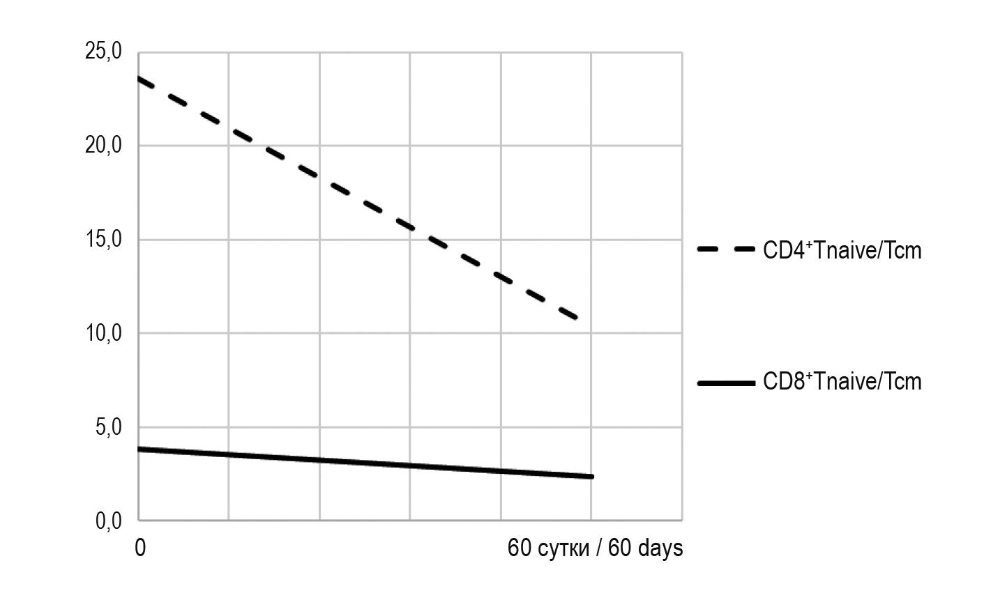 Note. The abscissa shows the days after CP injection, the ordinate shows the Tnaive/Tcm ratio. There is a decrease in the Tnaive/Tcm ratio for both subpopulations of T cells: a 2-fold decrease for T helpers and 1.6-fold for CTLs is registered by the 60th day.