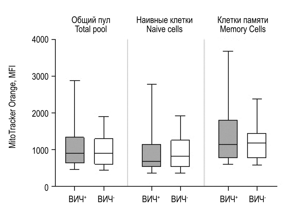 При исследовании трансмембранного потенциала и массы митохондрий CD4+Т-лимфоцитов было установлено следующее. Медиана интенсивности свечения потенциал-чувствительного красителя MT Оrange у ВИЧ+ была сопоставима с таковой в группе ВИЧ- (p > 0,05; рис. 1). Аналогичные данные были получены при оценке показателей в наивных элементах и клетках памяти (p > 0,05). При этом в последних заряд мембраны митохондрий был выше, что оказалось справедливым для обеих исследованных групп (p < 0,05).