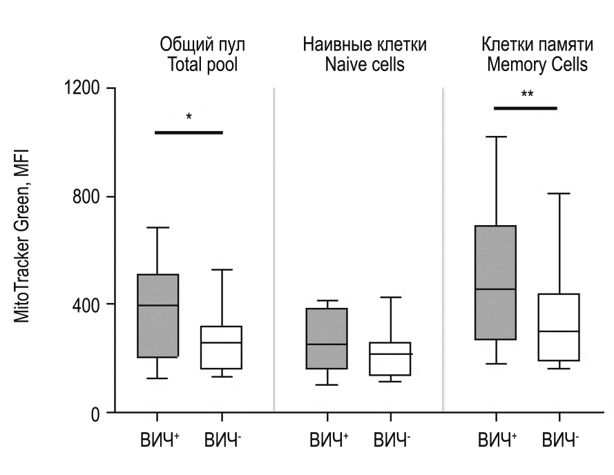 Рисунок 2. Исследование массы митохондрий в CD4+Т-лимфоцитах с использованием красителя MitoTracker Green. Примечание. По оси абсцисс указаны группы сравнения: ВИЧ-инфицированные (ВИЧ+) и неинфицированные (ВИЧ-) субъекты. По оси ординат показана медиана яркости флюоресценции (MFI: Median Fluorescence Intensity) MitoTracker Green в клетках, содержащих краситель в матриксе митохондрий. Представлены медианы (горизонтальные линии внутри прямоугольников), интерквартильные интервалы (прямоугольники) и 10-90% размахи (вертикальные отрезки). * – p < 0,05; ** – p < 0,01 (U-критерий Манна–Уитни). / Figure 2. Study of mitochondrial mass in CD4+T lymphocytes using MitoTracker Green dye. Note. The x-axis shows the comparison groups: HIV-infected (HIV+) and uninfected (HIV-) subjects. The y-axis shows the median fluorescence intensity (MFI: Median Fluorescence Intensity) of MitoTracker Green in cells containing the dye in the mitochondrial matrix. Medians (horizontal lines within boxes), interquartile ranges (boxes), and 10-90% ranges (vertical bars) are shown. *, p < 0.05; **, p < 0.01 (Mann–Whitney U test).