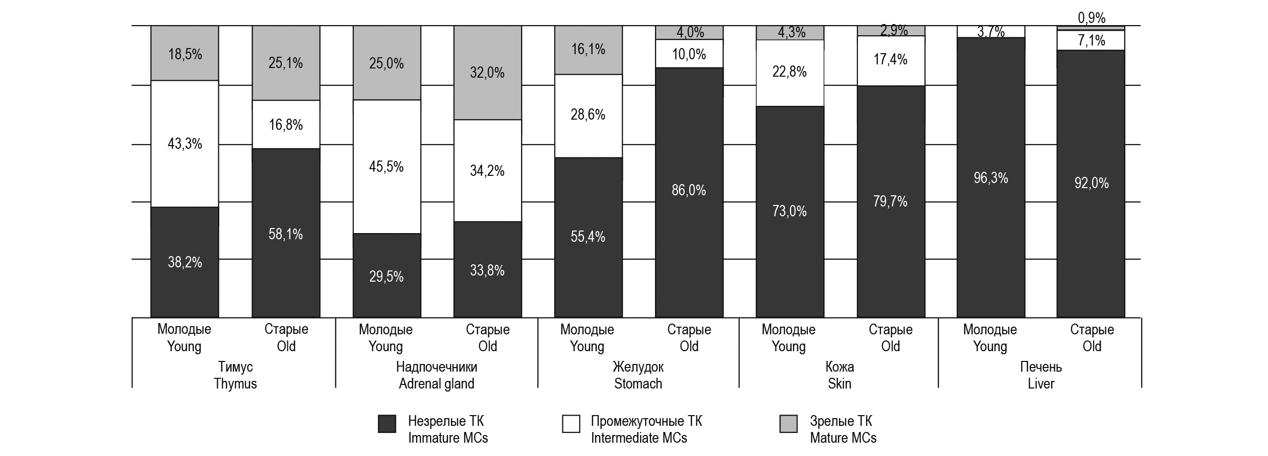 В печени, в отличие от других исследуемых органов, различия в ТК между молодыми и старыми животными не фиксируются (табл. 1). Это может быть обусловлено несколькими причинами. Так, их количество в печени изначально у молодых животных не велико и этого постоянного количества ТК в органе, характеризующихся постепенной небольшой дегрануляцией, достаточно для реализации регуляторных влияний на клетки печени. При этом отмечено, что большинство ТК в печени являются незрелыми (рис. 1), что свидетельствует о низкой скорости созревания ТК в данном органе вне зависимости от возраста животных. Это может быть связано с низким уровнем факторов в печени, стимулирующих их созревание.
