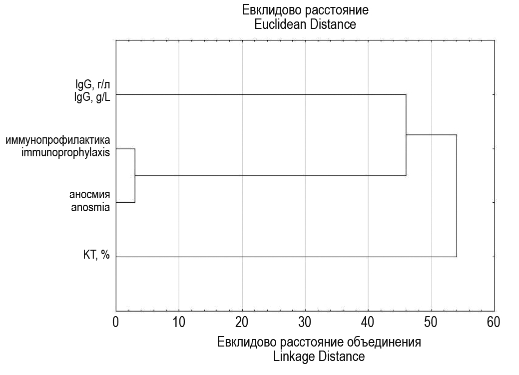 Рисунок 1. Фрагмент результата кластерного анализа клинико-лабораторных и инструментальных данных, полученных у обследованных, перенесших COVID-19. Примечание. Аносмия – случаи аносмии/дисгевзии; иммунопрофилактика – использование неспецифических иммунопрофилактических средств; IgG, г/л – антитела к SARS-CoV-2 класса G; KT, % – процент поражения тканей легких, установленный методом компьютерной томографии; Евклидово расстояние объединения. / Figure 1. Fragment of the result of cluster analysis of clinical, laboratory and instrumental data obtained from the examined patients who underwent COVID-19. Note. Anosmia, cases of anosmia / dysgeusia; immunoprophylaxis, use of nonspecific immunoprophylactic agents; IgG, g/L, antibodies to SARS-CoV-2 class G; KT, %, percentage of lung tissue damage determined by computed tomography; linkage distance, Euclidean linkage distance