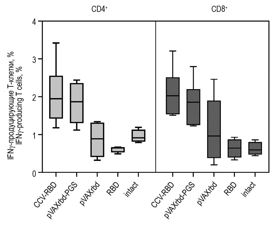 3. Figure 2. Percentage of SARS-CoV-2-specific IFNγ-producing CD4+ and CD8+T cells determined by ICS using flow cytometry. Note. The graphs were created with GraphPad Prism 8.0 software, the data are presented as a spread of values from minimum to maximum with the designation of the average values.