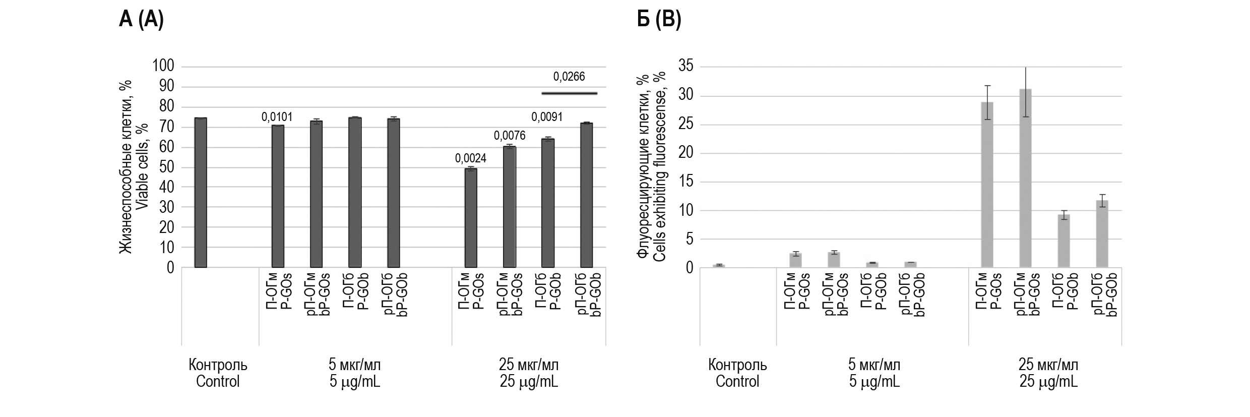 После инкубации была произведена оценка жизнеспособности клеток с помощью суправитального красителя Zombie Aqua (ZA) на проточном цитометре (Cytoflex S, Beckman Coulter, США). Кроме того, оценивали количество клеток, интернализовавших (адгезировавших) наночастицы ОГ, по интенсивности флуоресценции клеток (λex = 488 nm; bandpass filter: 720-840 nm; фильтр для красителя PC-7). Также нами была использована система визуализации (EVOS M5000, Thermo Fisher Scientific, США) для получения снимков каждого типа культур в лунках.