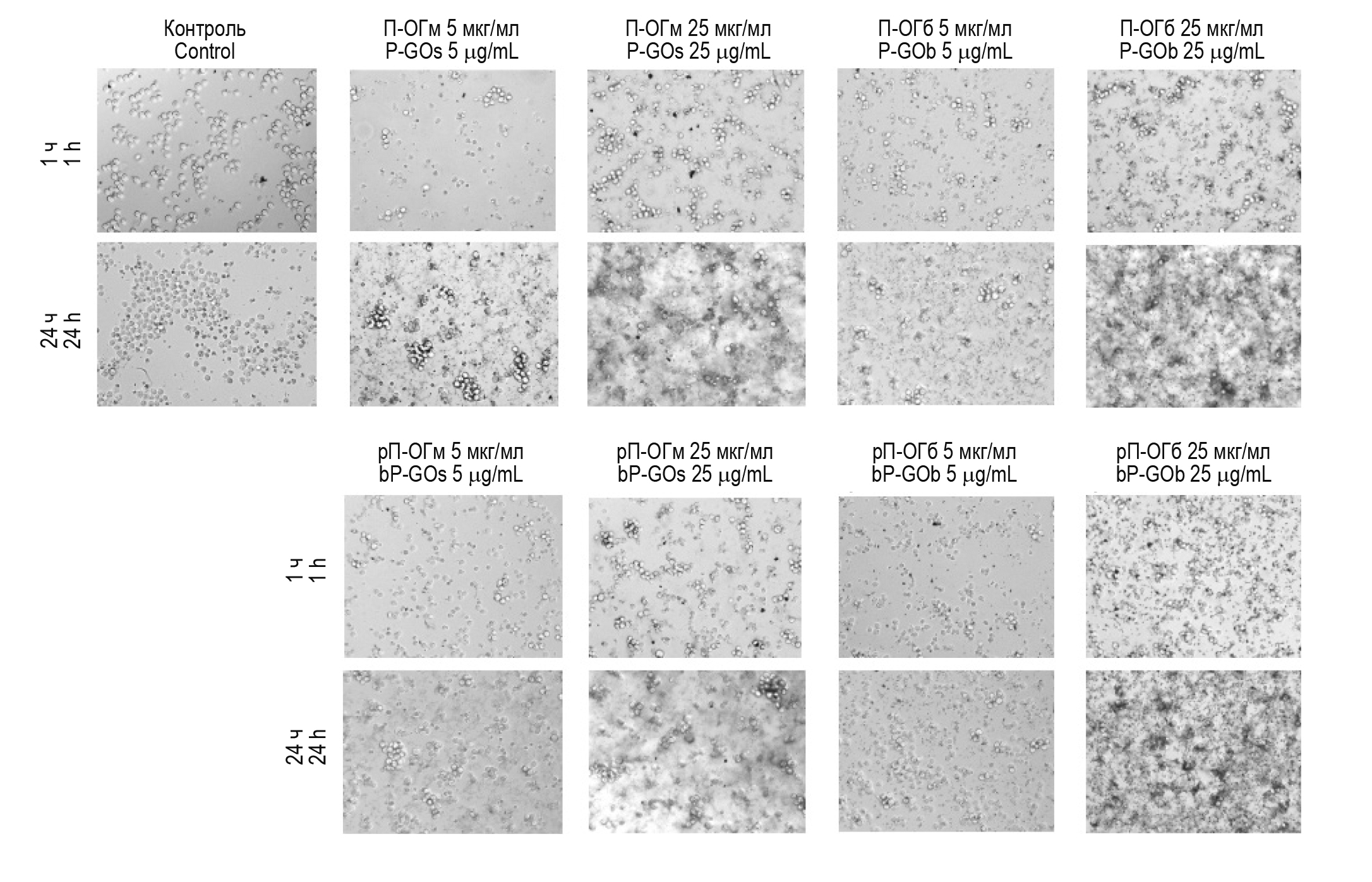 Для оценки влияния ОГ на жизнеспособность гибридомы BAP3, клетки вносили в концентрации 2 × 105 кл/мл в 48-луночные планшеты (Сorning, США). Далее в лунки добавляли наночастицы ОГ разных размеров, функционализированные линейным или разветвленным ПЭГ (П-ОГм, рП-ОГм, П-ОГб, рП-ОГб) до конечных концентраций 5 и 25 мкг/мл. Культуры инкубировали в течение суток при 37 °C и 5% CO2 (для оценки влияния ОГ на жизнеспособность клеток гибридомы). Для каждого вида наночастиц ОГ делали три повторности культуры, контролем служила культура клеток без наночастиц ОГ.