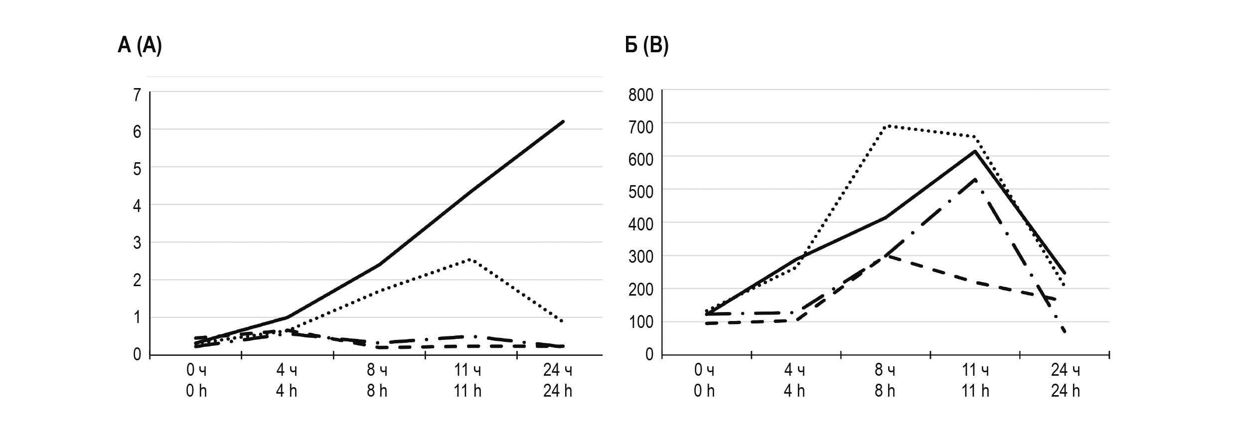 Примечание. По оси абсцисс: время, часы; по оси ординат: А – величина индекса N/L; Б –концентрация внДНК (нг/мл). Контроль – штрих (n = 3 ); 10 нг ЛПС – длинный штрих-пунктир (n = 3); 1 мкг ЛПС – круглые точки (n = 3); 100 мкг ЛПС – сплошная линия (n = 3).