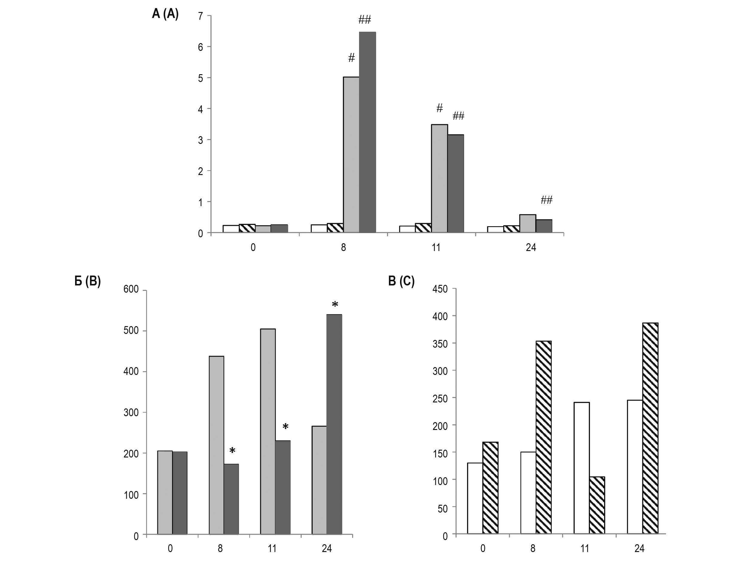 Примечание. По оси абсцисс: время, часы; по оси ординат: А – значение индекса N/L; Б, В – концентрация внДНК (нг/мл). Белые столбцы – контроль (n = 9 ); столбцы со штриховкой – TNF-св. белок (n = 6); серые столбцы – ЛПС (n = 8); черные столбцы – ЛПС + TNF-св. белок (n = 6). # – р < 0,05 – между ЛПС и контролем; ## – р < 0,05 – между TNF-св. белок и ЛПС + TNF-св. белок; * – р < 0,05 –между ЛПС и ЛПС + TNF-св. белок.