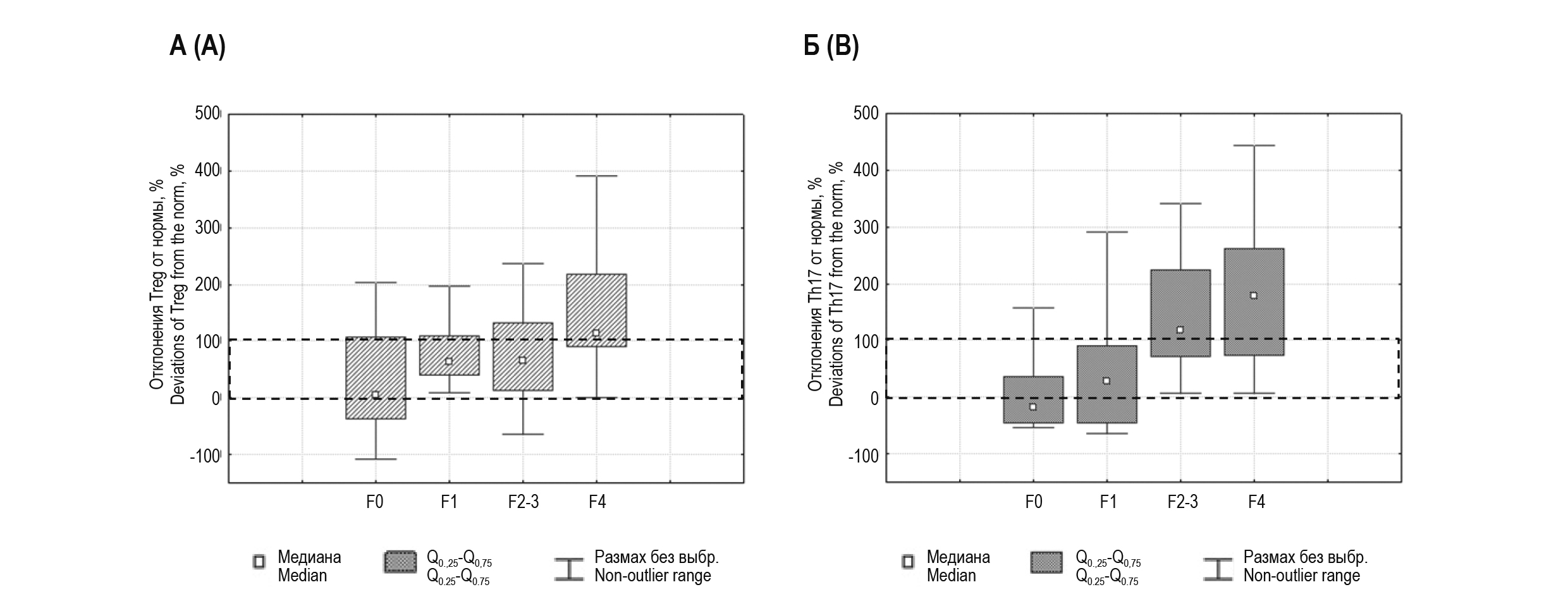 Рисунок 1. Отклонения показателей Тh17 и Тreg от возрастной нормы у детей с болезнью Вильсона–Коновалова в зависимости от стадии фиброза печени
