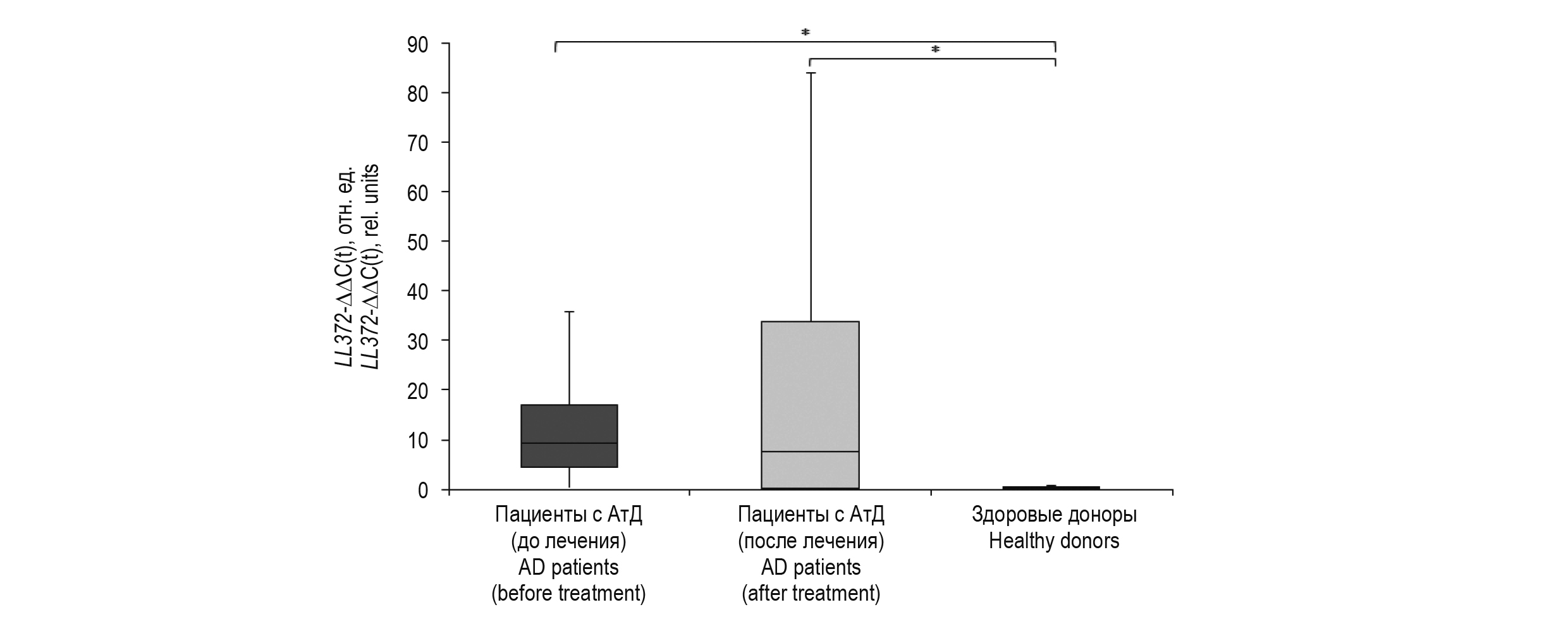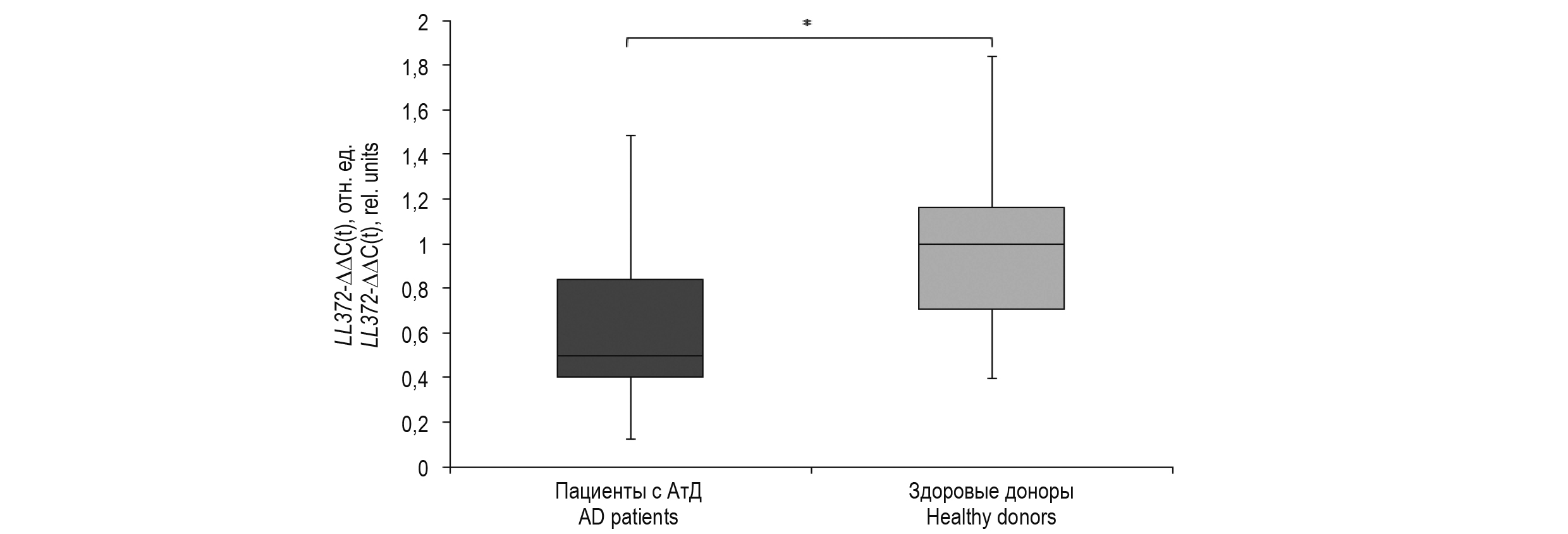 Рисунок 2. Уровень экспрессии гена LL37 в крови пациентов с АтД по сравнению с контролем