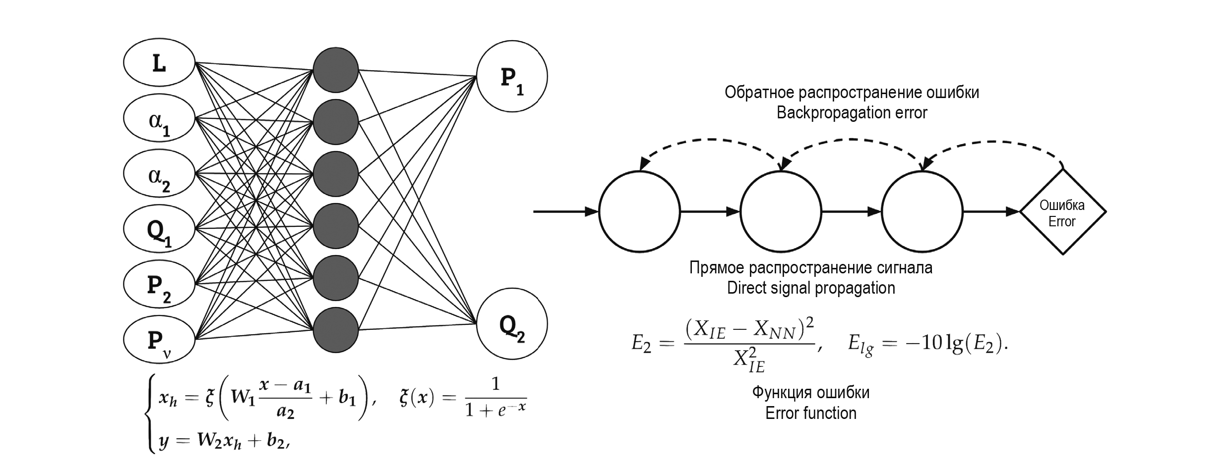 Примечание. На рисунке слева приведены: схема нейросети, система реализующих ее уравнений (xh – выходные значения скрытого слоя, W1, W2 – матрицы весовых коэффициентов для скрытого и результирующего слоя, b1, b2 – свободные коэффициенты для скрытого и результирующего слоя, a1, a2 – нормализующие коэффициенты для входных значений, ξ(x) – нелинейная функция активации); справа представлены принцип обучения нейронной сети методом обратного распространения ошибки, формула оценки ошибки результата вычислений.