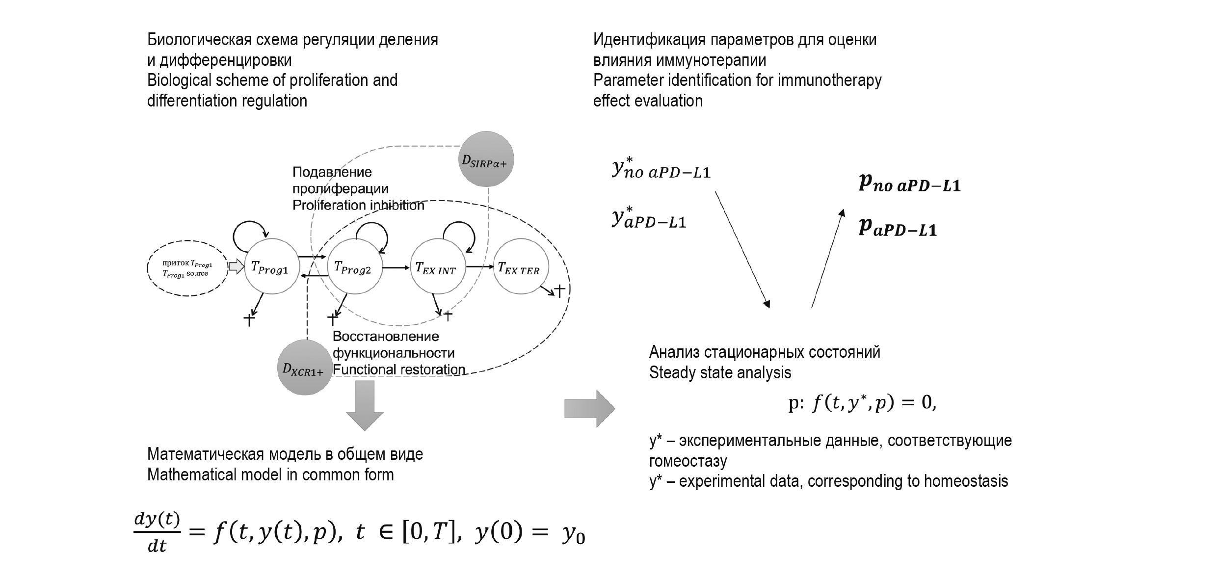 Отличительным признаком хронических вирусных инфекций и онкологических заболеваний являются нарушения работы иммунных механизмов, в частности, истощение T-лимфоцитов. Истощенные Т-лимфоциты экспрессируют ингибиторные рецепторы (такие как PD1, TIM3), обладают сниженной способностью к пролиферации, выделяют меньше цитокинов. В недавней работе [2] были выделены 4 субпопуляции истощенных Т-лимфоцитов, которые соответствуют различным стадиям дифференцировки и обладают различными характеристиками: TPROG1 (LY108+CD69+) – покоящиеся, резидентные, TPROG2: (LY108+ CD69-) – циркулирующие, пролиферирующие, TEXINT: (LY108-CD69-) – циркулирующие, обладающие слабым цитотоксическим эффектом, TEXTER: (LY108-CD69+) – покоящиеся, терминально истощенные. Баланс деления и дифференцировки данных субпопуляций поддерживается, в частности, за счет взаимодействия с дендритными клетками (DC). Так, SIRPa+ PD-L1+ DC ингибируют пролиферацию, а XCR+1 DC частично восстанавливают функциональность истощенных Т-лимфоцитов, способствуют делению их вместо дифференцировки. Истощение Т-лимфоцитов является частично обратимым за счет применения антител, блокирующих взаимодействие ингибиторных рецепторов и их лигандов. Предполагаемая биологическая схема регуляции дифференцировки и деления может быть сформулирована в виде системы ОДУ (рис. 3). Построенную математическую модель можно использовать, например, для анализа экспериментальных данных, описывающих гомеостаз системы. Для этого требуется идентифицировать параметры системы ОДУ, соответствующие ее стационарному состоянию. Описанный подход можно применить для оценки влияния терапии (например, aPD-L1) на параметры модели, характеризующие те или иные биологические процессы. Применение математического моделирования для прогнозирования эффекта иммунотерапии при ВИЧ-инфекции описано, например, в [8]. В случае анализа стационарных состояний системы нам требуется найти значения параметров, при которых правая часть системы равна нулю. В случае, если построенная модель является линейной, для решения задачи может применяться метод линейного программирования. В отличие от решения системы линейных алгебраических уравнений, при использовании этого подхода решается задача оптимизации с условиями, что, с одной стороны, позволяет учесть ограничения на параметры, с другой – искать вектор с минимальной нормой. Схема математического моделирования эффекта применения иммунотерапии на основе идентификации параметров Т-клеточного гомеостаза приведена на рисунке 3.