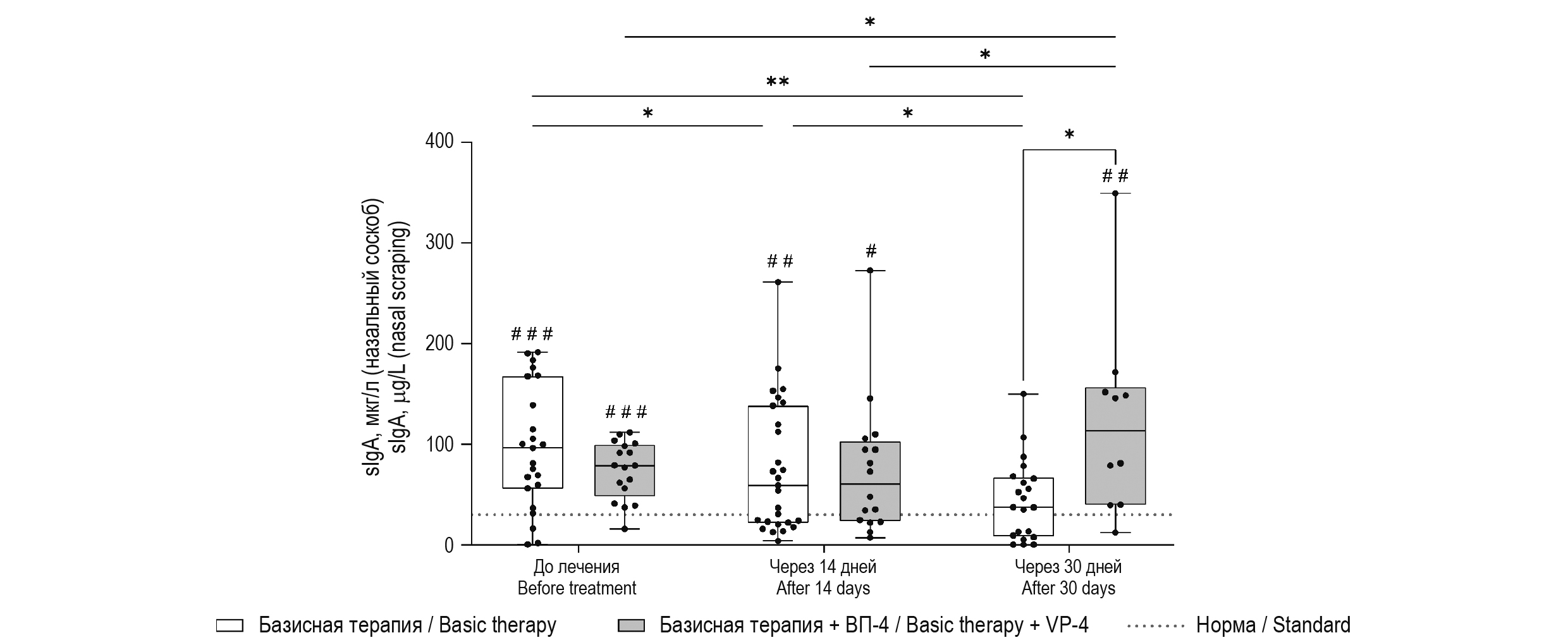 Figure 1. Dynamics of the level of sIgA in nasal scraping in a group of patients with moderate pneumonia receiving only basic therapy and a group of patients receiving basic therapy supplemented with Immunovac-VP-4 (initially, after 14 and 30 days), individual values, median, interquartile range, minimum and maximum values are given