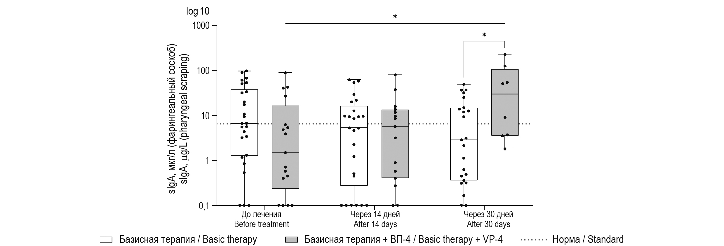 Figure 2. Dynamics of the sIgA level in pharyngeal scraping in a group of patients with moderate pneumonia who received only basic therapy and a group of patients who received basic therapy supplemented with VP-4 (initially, 14 and after 30 days), individual values, median, interquartile range, minimum and maximum values are given
