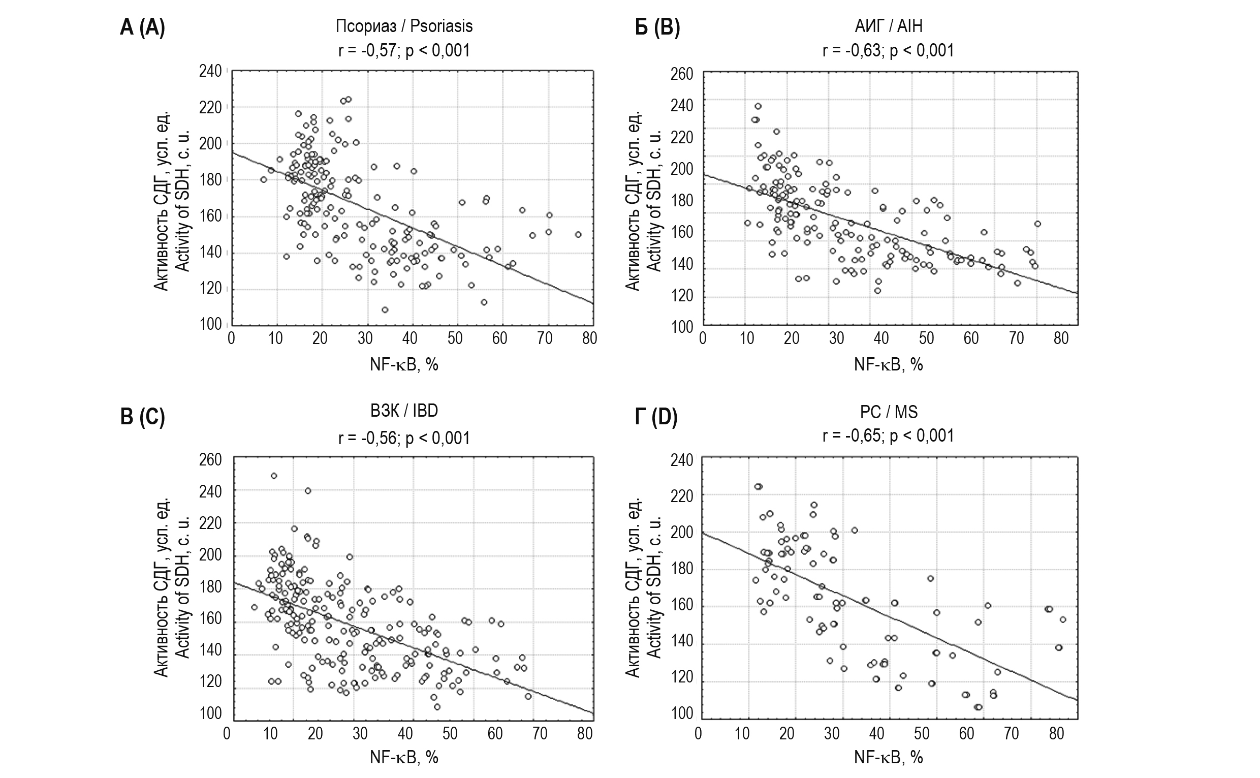 Следующий этап работы включал определение зависимости между уровнем транслокации NF-κB и активностью митохондриальных дегидрогеназ в лимфоцитах у детей с АИЗ и в группе сравнения. В группе сравнения анализ показал обратную корреляционную зависимость: чем выше уровень транслокации NF-κB в популяциях лимфоцитов, тем ниже активность СДГ (r = -0,49; р < 0,001) и ГФДГ (r = -0,31; p = 0,001). Выявлена аналогическая обратная зависимость между уровнем транслокации NF-κB и активностью СДГ для детей с РС (r = -0,65; р < 0,001), с АИГ (r = -0,63; р < 0,001), с ВЗК (r = -0,56; р < 0,001) и псориазом (r = -0,57; р < 0,001; рис. 1). Зависимость уровня транслокации NF-κB и активности ГФДГ в популяциях лимфоцитов менее выражена из-за большого разброса показателей.