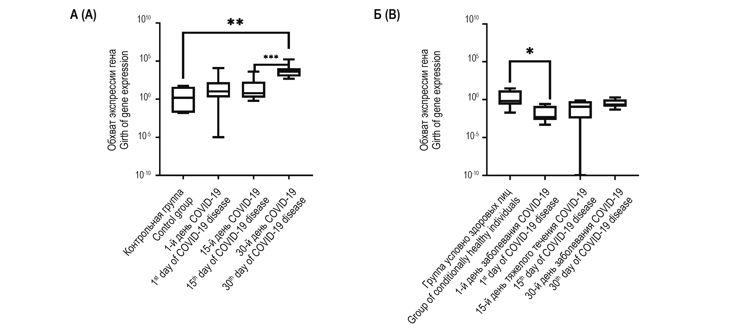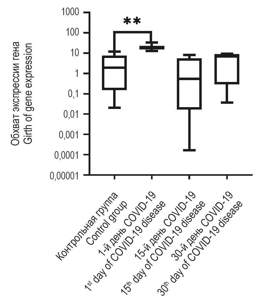 Примечание. По оси абсцисс – время и группы. По оси ординат – относительные единицы от числа копий β-актина. ** – 0,001 < p ≤ 0,05 по тесту Манна–Уитни.