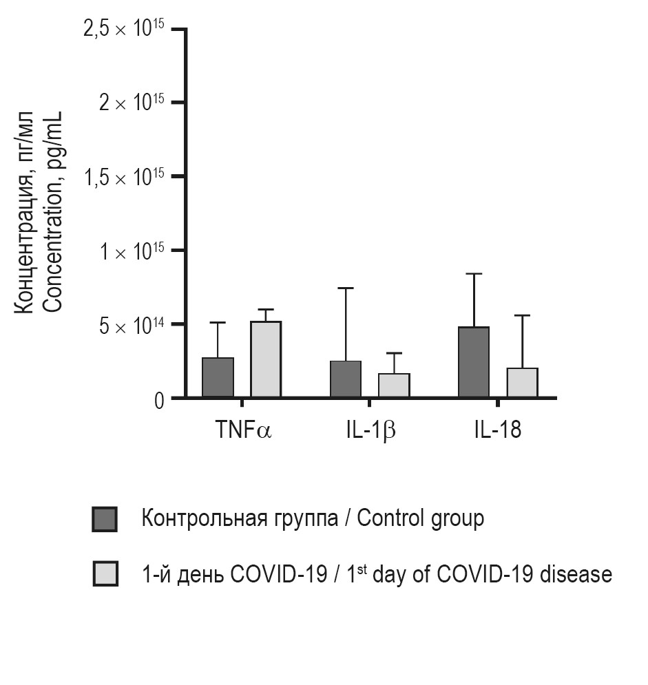 Note. The abscissa shows groups and proteins. Y-axis concentration (pg/mL). Gray color, 1 day of COVID-19 disease. Black color, control group.