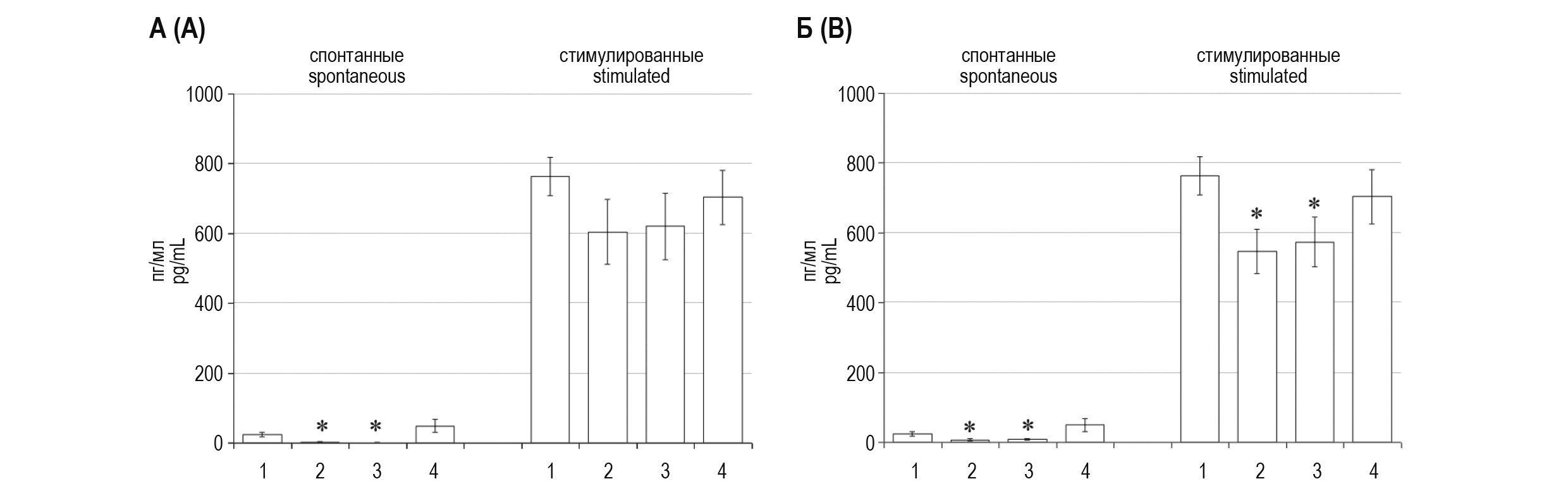 Figure 3. Effect of 10 min (A) and 60 min (B) cold stress on spontaneous and stimulated production of IL-4 by mouse splenocytes under conditions of blockade of opiate receptors