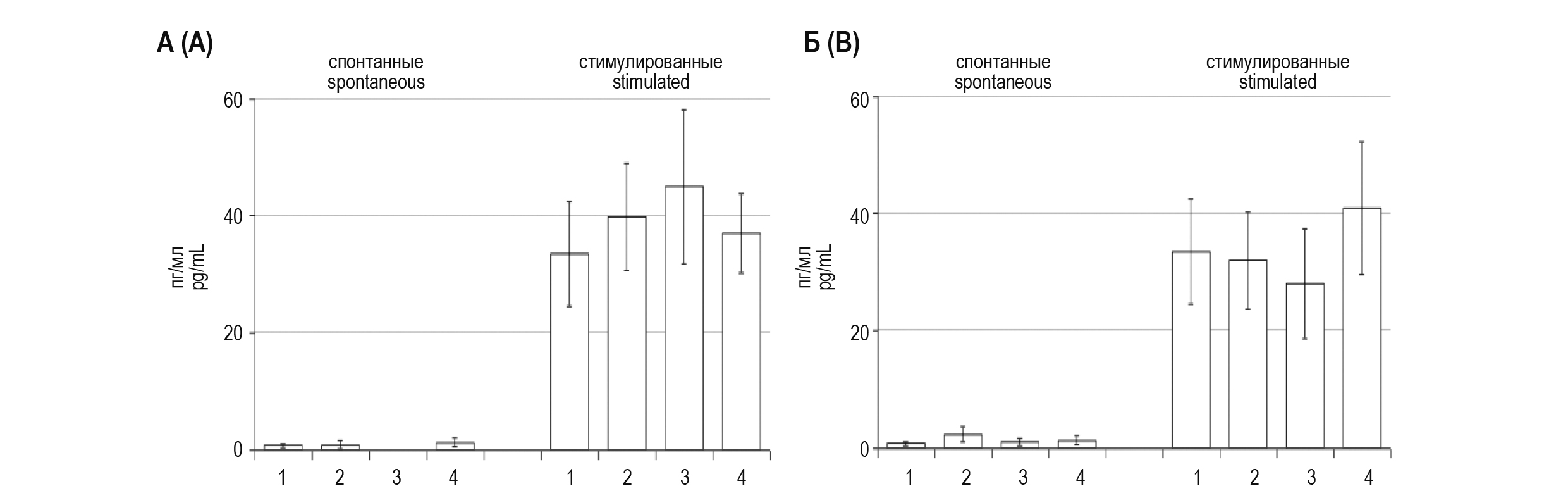 Рисунок 3. Влияние 10 мин (А) и 60 мин (Б) холодового стресса на спонтанную и стимулированную продукцию IL-4 спленоцитами мыши в условиях блокады опиатных рецепторов
