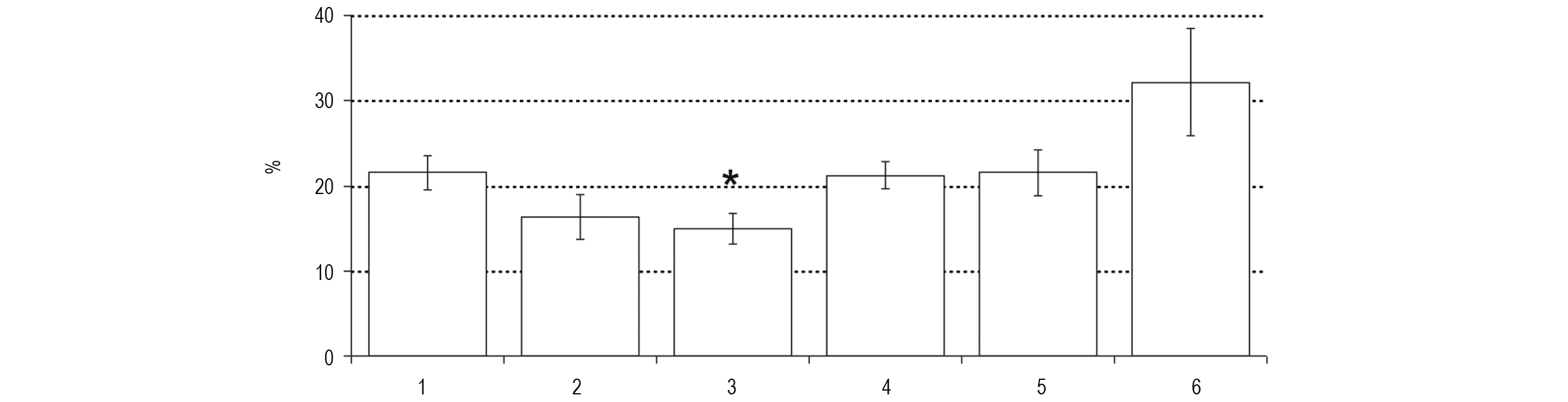 Примечание. По оси ординат: процент CD11+ клеток, поглотивших микроорганизмы. По оси абсцисс: 1 – контроль, 2 – стресс 10 мин, 3 – стресс 60 мин, 4 – стресс 10 мин на фоне введения налоксона, 5 – стресс 60 мин на фоне введения налоксона, 6 – налоксон. * – p < 0,05 по отношению к контролю, (n = 9).