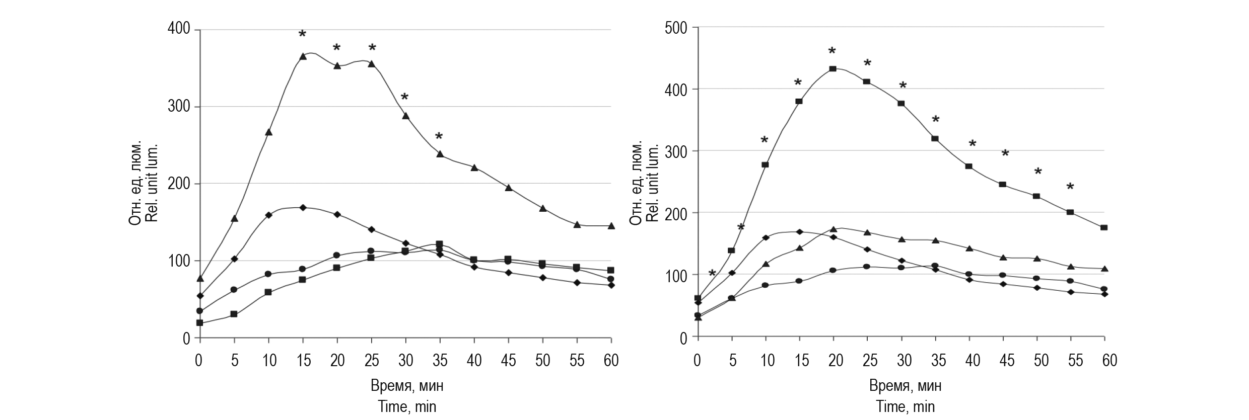 Генерацию активных форм кислорода перитонеальными макрофагами оценивали с помощью спонтанной и индуцированной реакции люминол-зависимой хемилюминесценции (ЛЗХЛ). В 96-луночные непрозрачные белые плоскодонные планшеты вносили 105 клеток в 100 мкл раствора Хенкса. В качестве индуктора ЛЗХЛ использовали опсонизированный зимозан в концентрации 150 мкг/мл. В качестве маркера выраженности реакции ЛХЗЛ использовался люминол 10-5 М. Регистрация результатов проводилась в течение часа с интервалом в 5 мин с помощью многофункционального спектрофотометра TECAN (Австрия).