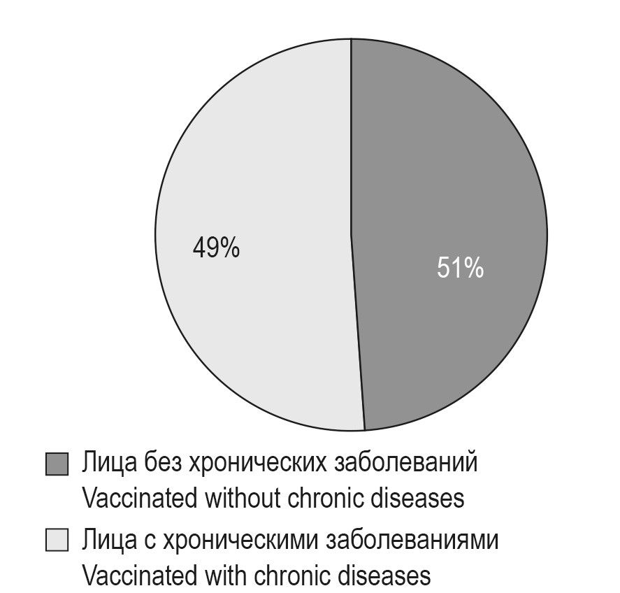 Вакцинопрофилактика людей с хронической патологией в настоящее время имеет важное значение. Профилактические прививки не только способствуют формированию у этого уязвимого контингента специфического иммунитета к иммуноуправляемым инфекциям, но и активируют систему врожденного иммунитета для защиты от новых, пока недостаточно изученных инфекционных заболеваний [3]. В рамках нашего исследования были привиты 49% лиц, страдающих хроническими заболеваниями (рис. 1). Патологических прививочных реакций и нежелательных явлений у вакцинированных зарегистрировано не было.
