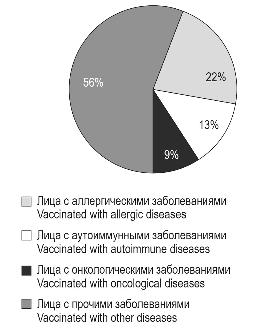 Среди привитых, страдающих хронической патологией, наибольшее количество составили пациенты с заболеваниями сердечно-сосудистой системы, нервной системы и опорно-двигательного аппарата – 56%. Из общего количества привитых аллергическими заболеваниями страдали 22%, пациенты с онкопатологией – 9%, с аутоиммунными заболеваниями – 13% (рис. 2).