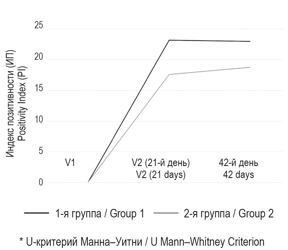 Анализ уровня иммуноглобулина-G к белкам SARS-CoV-2 показал, что индекс позитивности (ИП) у пациентов в 1-й группе на 21-й день (ИП = 23,2) после проведения V1 был выше в сравнении с показателем у пациентов 2-й группы (ИП = 17,6). Также отмечалось статистически достоверное различие в уровне ИП в группах на 42-й день. У пациентов, которые получили две вакцинации (V1+V2), ИП в 1-й группе был достоверно выше (ИП = 23,0) в сравнении с показателем во 2-й группе (ИП = 18,8) (рис. 3).