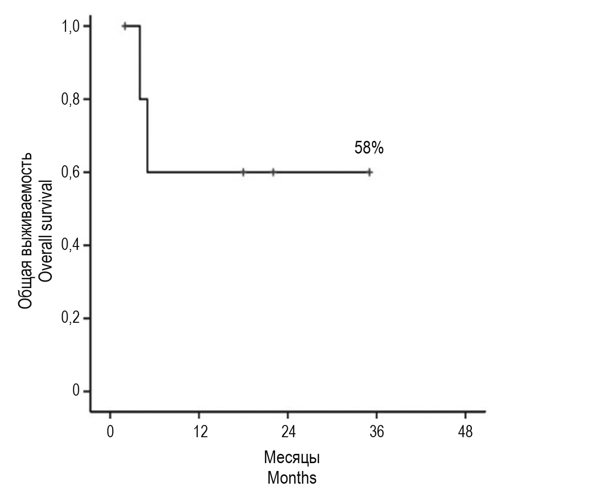 Медиана наблюдения за пациентами составила 67 месяцев. Двухлетняя ОВ составила 58% (рис. 1). Всего было проведено 121 введение аллоИК и 105 введений ДВ у 5 пациентов. Следует отметить низкую токсичность терапии. Из побочных эффектов отмечались кожная реакция в виде гиперемии в местах проведения вакцинации у 3 больных, у 2 также отмечалась локальная мышечная болезненность, лихорадка до 38 °С. Специального лечения указанные реакции не требовали и купировались самостоятельно. На 121 интратекальное (интравентрикулярное) введение наблюдалось 8 (7%) эпизодов постпункционного синдрома длительностью не более 24 часов, который был не требовал интенсивного лечения.