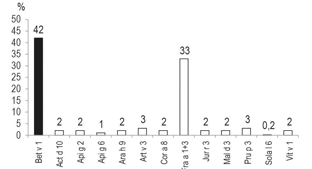 Роль профилинов как пищевого аллергена долгое время недооценивали. В настоящее время до ٥٠٪ пациентов с пищевой аллергией на растительную пищу имеют сенсибилизацию к профилинам [5, 8]. Так, например, в северо-западных регионах Испании, где частота выявления IgE-аТ к аллергенам пыльцы трав достигает 76% и выше, сенсибилизация к профилинам также высока – до 50% [1]. У пациентов в средней полосе России частота выявления IgE-аТ к профилинам, в том числе и березы (Bet v 2) невысока и варьирует от 5% до 7%. Тогда как частота выявления IgE-аТ к Bet v 1 достигает 42%.