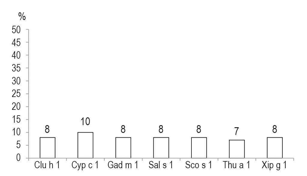 Из 440 сывороток в 48 (11%) были выявлены IgE-аТ против парвальбуминов. Всего в исследовании было использовано 7 молекул парвальбуминов: из сельди (Clupea harengus) – Clu h 1, карпа (Cyprinus carpio) – Cyp c 1, атлантической трески (Gadus morhua) – Gad m 1, лосося (Salmo salar) – Sal s 1, атлантической макрели (Scomber scombrus) – Sco s 1, тунца (Thunnus albacares) – Thu a 1, рыбы-меч (Xiphias gladius) – Xip g 1.
