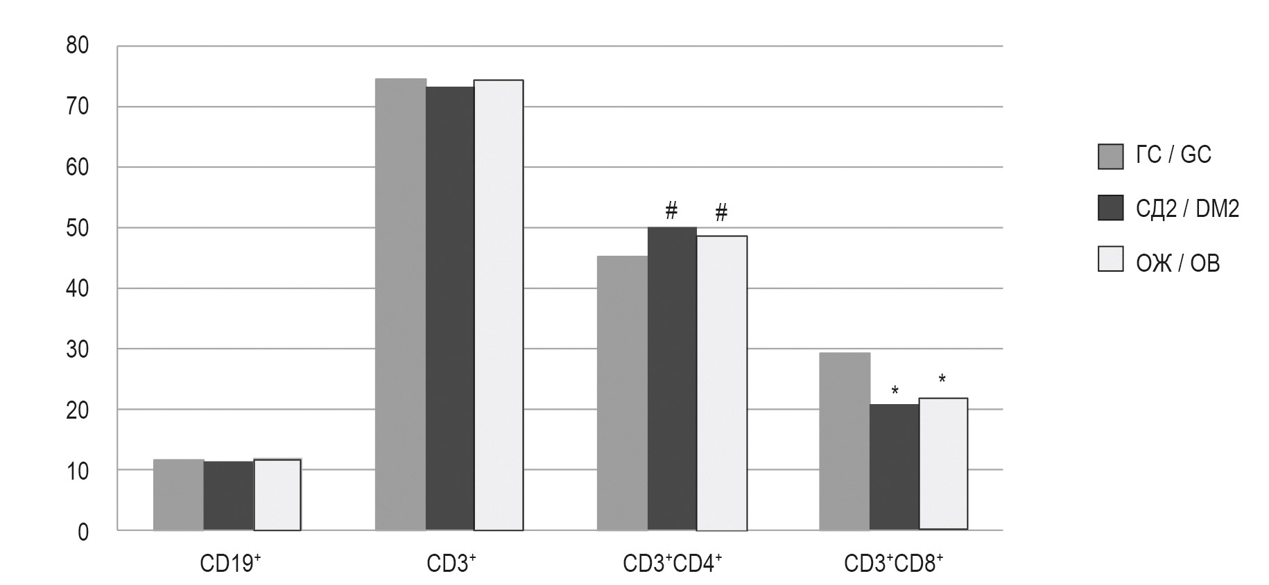 Одним из важных информативных методов оценки иммунной дисфункции при ОЖ является изучение субпопуляционного состава лимфоцитов, маркеров активации и функциональной способности клеток [12]. Mетаболизм Т-лимфоцитов определяет их эффекторную функцию, поэтому ассоциированные с ОЖ изменения в биоэнергетике Т-лимфоцитов, приводят к функциональным изменениям на клеточном уровне, изменяют метаболом и уровни цитокинов/хемокинов [6].