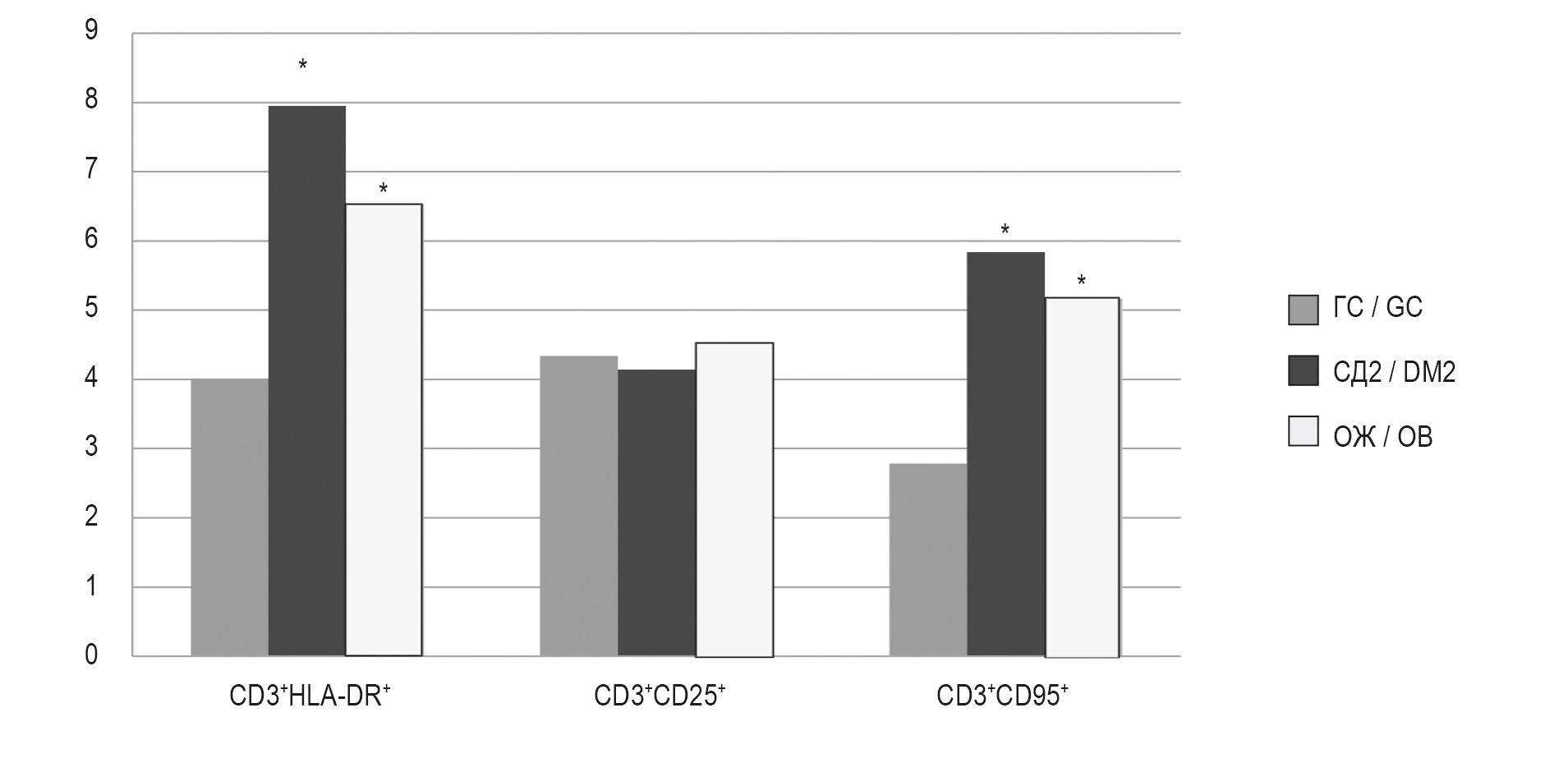 В результате исследования установлено у пациентов в группах СД2 и ОЖ относительно ГС (рис. 2) достоверное (р < 0,05) повышение процента Т-лимфоцитов, экспрессирующих поздний маркер активации HLA-DR (CD3+HLA- DR+), что характерно для многих хронических воспалительных заболеваний [2]. Наличие CD95-антигена (АРО-1, Fas-антиген) на активированных лимфоцитах свидетельствует об активации процесса апоптоза. Апоптоз – физиологический процесс генетически запрограммированной гибели клетки и является важным механизмом регуляции иммунного ответа [7]. В исследовании обнаружено достоверное (р < 0,05) повышение процента лимфоцитов (CD45+CD95+) в группах больных с ОЖ и СД2 относительно ГС (рис. 2). Апоптоз лимфоцитов у больных СД2 и ОЖ является активатором клеточной дисфункции, что приводит к снижению иммунитета и увеличению частоты инфекционных заболеваний [14].