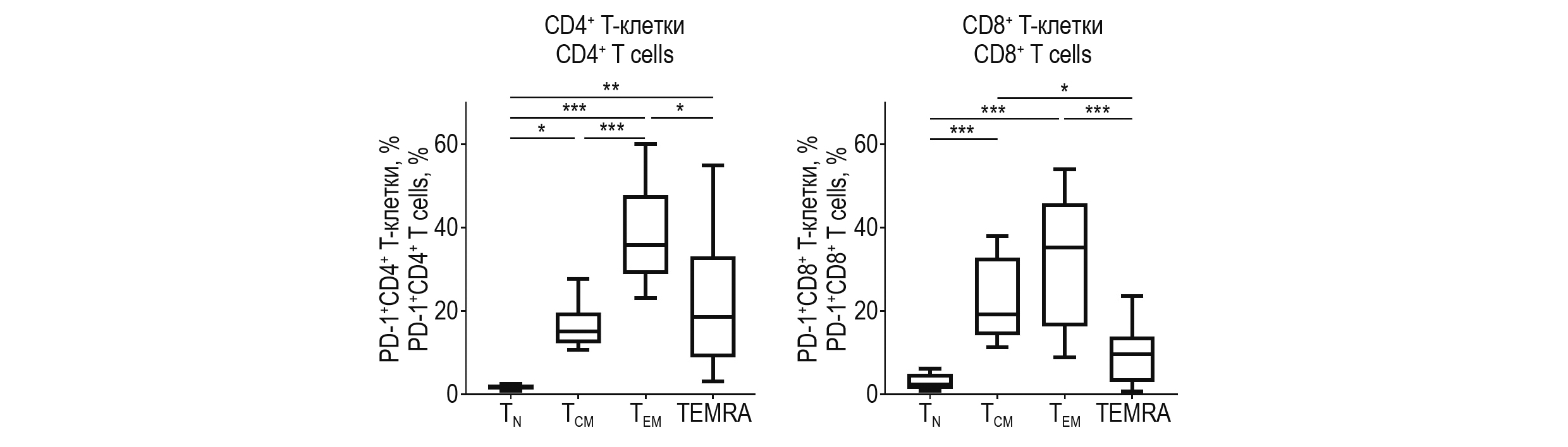 Полученные данные демонстрируют, что у здоровых субъектов экспрессия ингибиторных рецепторов PD-1 и TIGIT на CD4+ и CD8+Т-лимфоцитах существенно зависит от стадии дифференцировки клеток. Этот факт необходимо учитывать при анализе данных, особенно в контексте истощения Т-лимфоцитов. Вероятнее всего, что у здоровых лиц наличие большой доли Т-лимфоцитов памяти, несущих на своей мембране ингибиторные рецепторы, служит для регуляции иммунных реакций и поддержания гомеостаза и не свидетельствует о развитии истощения. Данные о том, что у здоровых людей Т-клетки, экспрессирующие супрессорные молекулы, способны активно функционировать, были представлены ранее. Так, было показано, что цитотоксическая активность CD8+Т-лимфоцитов прямо коррелирует с относительным количеством TIGIT+ клеток в популяции [1].