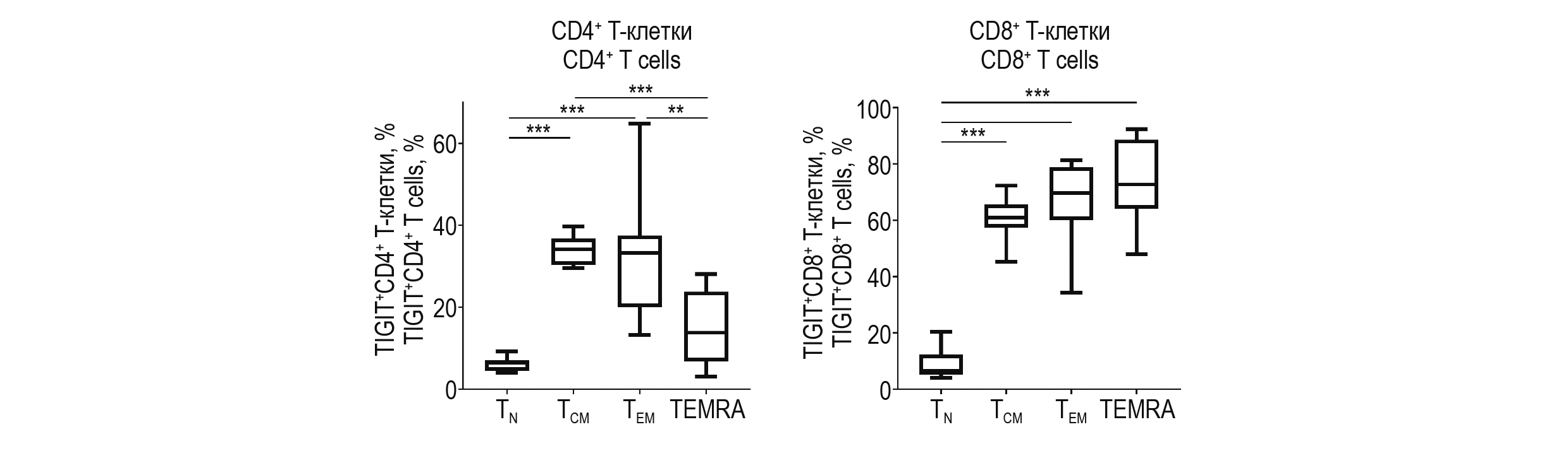 Вместе с тем экспрессию ингибиторных рецепторов на клетках связывают с феноменом истощения Т-лимфоцитов. Под иммунным истощением понимают процесс постепенной утраты Т-клетками способности производить цитокины и делиться [14]. Самым распространенным маркером, используемым для определения истощенных Т-клеток, является PD-1. Возможность применения других супрессорных молекул, например TIGIT, для идентификации истощенных Т-клеток находится в стадии апробации. Предварительные исследования показали, что число Т-клеток, экспрессирующих рецепторы PD-1 и TIGIT, повышается при онкологических и аутоиммунных заболеваниях, а также хронических инфекциях [11, 15]. Тем не менее мало известно о том, как эти ингибиторные рецепторы экспрессируются в норме. В частности, отсутствуют данные о том, как данные молекулы экспрессируются на CD4+ и CD8+Т-лимфоцитах, принадлежащих к различным субпопуляциям. Кроме того, открытым остается вопрос о том, как соотносятся профили экспрессии TIGIT и наиболее распространенного маркера – PD-1 – в Т-клетках здоровых людей.