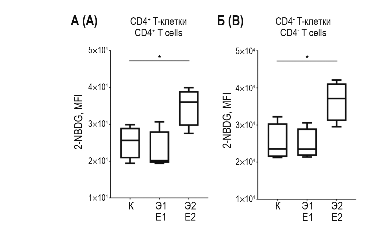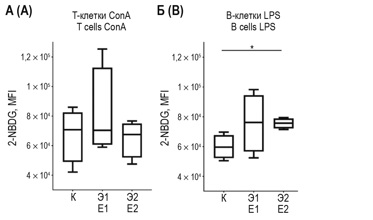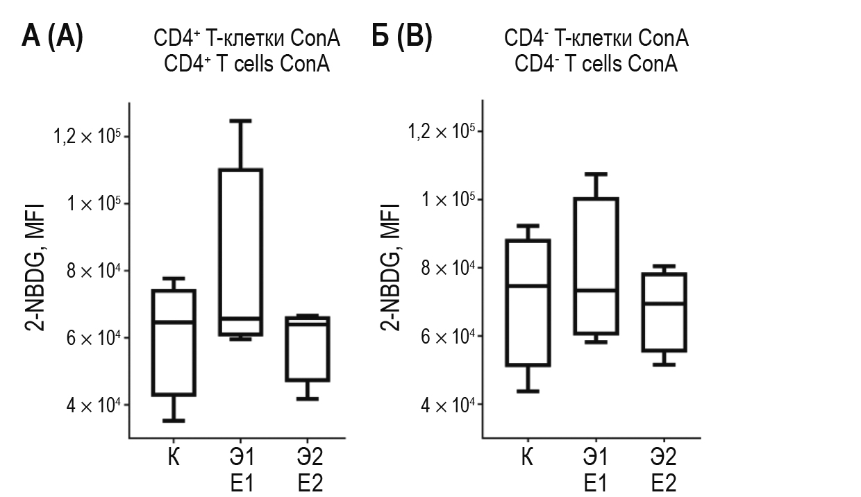Поглощение глюкозы клетками оценивали с использованием флуоресцентных аналогов глюкозы (2-NBDG). Клетки, окрашенные поверхностными антителами, инкубировали в среде, содержащей 80 мкМ 2-NBDG (Abcam, Великобритания) при 37 °С в течение 15 мин. Затем двукратно вносили DPBS, содержащий 1% бычьего сывороточного альбумина (Bovine Serum Albumin – BSA; Sigma-Aldrich, США), и осаждали клетки центрифугированием (1000 g, 3 мин). Образцы ресуспендировали в 100 мкл DPBS и инкубировали в течение 5 мин при температуре +4 °С перед цитометрическим анализом.
