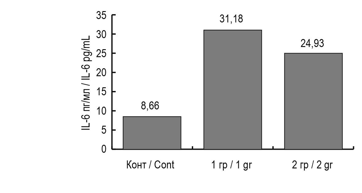Анализ сывороточной концентрации IL-6, приведенный на рисунке 1, установил, что в 1-й группе девочек с олигоменореей с дефицитом массой тела уровень изученного цитокина был повышен в 3,6 раза со средним значением 31,18±1,08 пг/мл (р < 0,001), во 2-й группе девочек с олигоменореей с нормальной массой тела повышен в 2,8 раза и в среднем составил 24,93±1,17 пг/мл (р < 0,001), тогда как в группе контроля данный показатель в среднем составил 8,66±0,55 пг/мл.