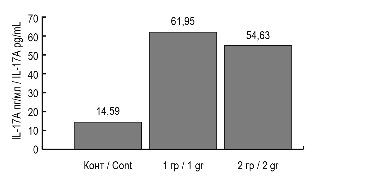 Интерлейкин-17 (IL-17) относится к провоспалительным цитокинам и участвует во многих этапах иммунного ответа. Он стимулирует продукцию хемокинов и, как следствие, стимулирует миграцию нейтрофилов к месту воспаления. Семейство провоспалительных цитокинов IL- 17 (IL-17A-F) играет многогранную роль в воспалении, аутоиммунитете и защите хозяина [8]. IL- 17A, наиболее охарактеризованный из них, может вырабатываться многими клетками, однако наиболее выраженную продукцию обеспечивают Т-хелперы 17-го типа (Th17). IL-17 вызывает провоспалительные реакции, провоцируя экспрессию других цитокинов (IL-6, TNFα), хемокинов (CXCL1, CXCL2, CCL20), воспалительных эффекторов [7, 8].