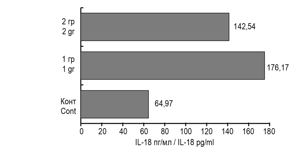 Интерлейкин-18 (IL-18) – уникальный цитокин, участвующий в активации и дифференцировке различных популяций Т-клеток. Вместе с IL-12 IL-18 участвует в парадигме Th1. Независимо от IFNγ или других цитокинов, IL-18 проявляет характеристики других провоспалительных цитокинов, такие как увеличение молекул клеточной адгезии, синтез оксида азота и продукция хемокинов [8].