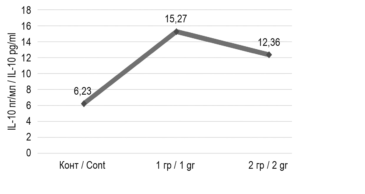 Интерлейкин-10 (IL-10) представляет собой мощный противовоспалительный цитокин, который играет решающую и часто существенную роль в предотвращении воспалительных и аутоиммунных патологий [8]. Ключевой противовоспалительный фактор, который ингибирует продукцию TNFα, IL-1β и IL-6. Основными источниками IL-10 являются Т-хелперные клетки, моноциты, макрофаги и дендритные клетки [7].