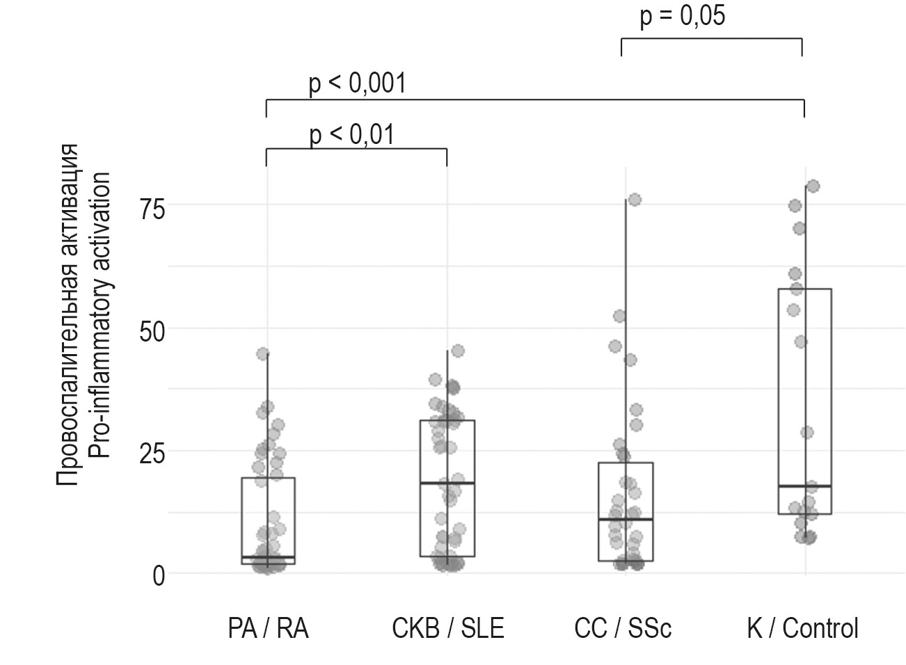 Примечание. p – уровень значимости, РА – ревматоидный артрит, СКВ – системная красная волчанка, СС – системный склероз, К – контрольная группа.