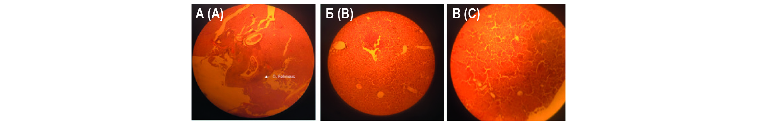 Заражение проводилось путем перорального введения метацеркариев Of всем трем группам (доза заражения: 50 метацеркариев). Длительность наблюдения составила 24 дня, во время которых экспериментальные группы ежедневно получали по 3 капли Bb и ККЭ перорально. Условия содержания, экспериментальной работы и вывода животных из эксперимента соответствовали Европейской конвенции о защите позвоночных животных, используемых для экспериментов или в иных научных целях (1986), и российскому законодательству (ГОСТ 33215-2014 «Руководство по содержанию и уходу за лабораторными животными» от 01.07.2016). По истечению времени эксперимента была изъята печень и кровь хомячков всех групп для гистологического исследования и определения количества цитокинов. Для описательной морфологии органа использовали метод световой микроскопии. Гистологические препараты изучали с использованием бинокулярного светового микроскопа. Срезы изготавливались с помощью автоматического ротационного микротома Leica RM 2255 («Лейка Биосистемс Нуслох ГмбХ», Германия. Толщина 5 мкм. Межгрупповое сравнение данных проводили в соответствии протоколом «Морфологические ведомости» – Morphological Newsletter: 2022 Том (Volume) 30 Выпуск (Issue) с помощью непараметрического критерия Манна–Уитни (U) для парных выборок с ненормальным распределением, при уровне доверительной вероятности р ≤ 0,05.