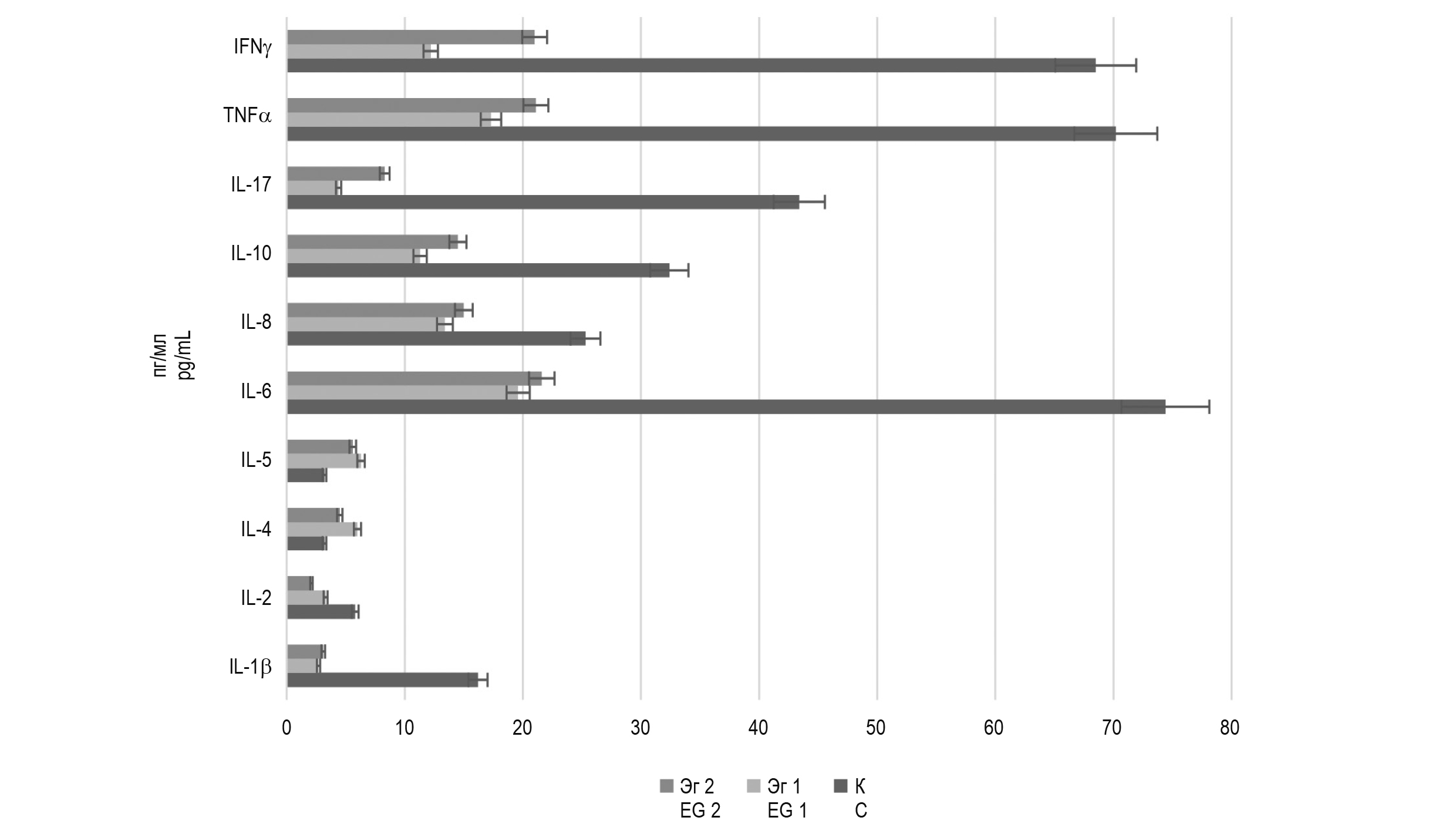 При оценке результатов было установлено, что профиль и уровень цитокинов изменялся в зависимости от вводимого супернатанта (рис. 2). В контрольной группе наблюдалось повышение количества провоспалительных цитокинов. В экспериментальной группе ЭГ 1 в сравнении с контролем в 4 раза уменьшалась способность лимфоцитов продуцировать основной провоспалительный цитокин TNFα. Супрессирующий эффект наблюдался и в отношении IL-1β, IL-2, IL-6, IL-8, IFNγ (на 83,9±0,2; 43,1±0,3; 73,7±1,0; 48,0±1,1; 82,2±0,7% соответственно). Вместе с тем отмечалось угнетение продукции основного противовоспалительного цитокина IL-10 на 64±1,04%, но при этом в сравнении с контролем увеличивался уровень IL-4, IL-5 на 87,5±0,2 и 95,9±0,2% соответственно. После введения ККЭ в ЭГ 2 мы наблюдали схожие результаты с ЭГ 1: супрессирующий эффект в отношении провоспалительных цитокинов (IL-1β, IL-2, IL-6, IL-8, IFNγ на 80,8±0,1; 63,3±0,5; 71,0±1,1; 40,7±1,5; 69,3±1,4% соответственно), активацию продукции лимфоцитами IL-4 и IL-5 на 40,6±0,9% и 80,6±0,3% в сравнении с контролем. Уровень IL- 17 снижался в обеих ЭГ, причем в ЭГ 1 в 10 раз (на 89,9±0,8%), а в ЭГ 2 в 5 раз (на 80,8±1,2%), что объясняется тем, что IL-17 располагается в слизистой оболочке кишечника, которую в большей степени населяют Bb. Активация продукции противовоспалительных цитокинов в обеих группах модулирует иммунный ответ в сторону Th2, что способствует блокированию воспалительных эффектов.
